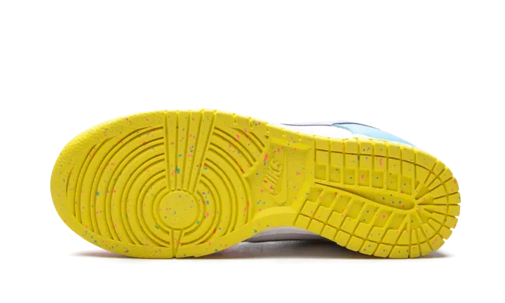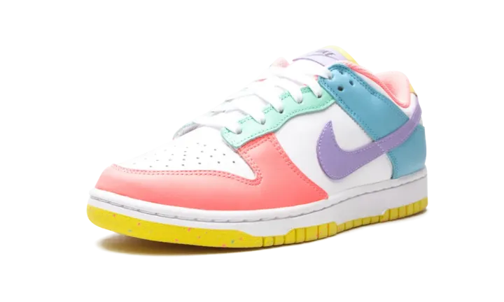 The Women's Nike Dunk Low SE "Easter" is a colorful women's version of the ever-popular lifestyle sneaker. Dressed in a combination of white leather and soft pastels, the "Easter" was released in Spring 2021 and clearly draws inspiration from the holiday of the same name. As mentioned, white leather appears on the design, forming the base of the shoe. Calming shades of pink, mint green, light blue, and purple appear in a mismatched color block on both the left and right shoe. Brown "Nike" branding resides on the yellow leather heel tab and mismatched tongue tags display classic "Nike" insignia. White laces are placed on the crisp white nylon tongue. A white rubber midsole and yellow outsole with a multicolor speckle motif completes the look. Release date: Spring 2021.