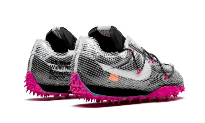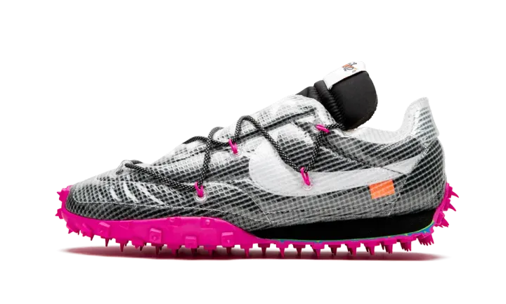 The Off-White x Nike Waffle Racer SP "Black/Fuchsia" is the women's sizing of the Virgil Abloh's take on the legendary Waffle Racer design. The "Black/Fuchsia" colorway is one of three included in a fall 2019 collection between Abloh's Off-White fashion label and Nike. Like many of the archival Nike silhouettes that Abloh has reinterpreted, the Waffle Racer now features a drastic new appearance. A standard black nylon covers the upper with a film-like synthetic mesh layered on top of the nylon material. Contrast appears in the form of a white Swoosh branding hit on the mid-panel with speckled black and white rope laces and pink accented eyelets breaking up the shadowy vibe. A black nylon tongue with white-based Nike branding, along with a dark green hang tab complete the look of the upper. Pink rubber spikes placed on the outsole keep in line with the Waffle Racer's performance heritage. Release date: October 24th, 2019.