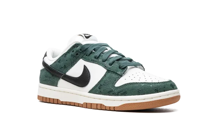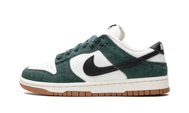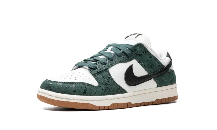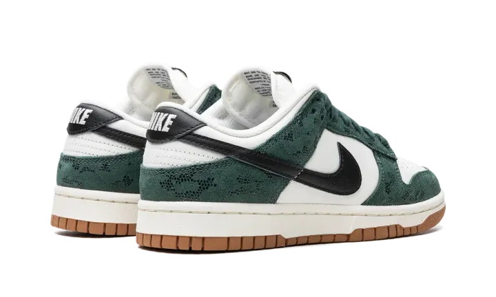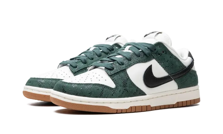 The Women's Nike Dunk Low "Green Snake" is a women's-exclusive colorway of the retro basketball shoe with reptilian accenting. The "Green Snake" features a unique combination of smooth and textured panels, the latter of which are arranged in a scale-like texture on the shoe's overlays. The upper is complete with a white leather base and Pro Green overlays with the reptilian pattern. A black leather Swoosh appears on each side. "Nike" is embroidered on the heel and printed on the tongue tag with a Swoosh. Release date: October 17, 2023