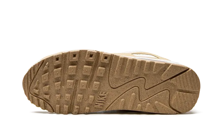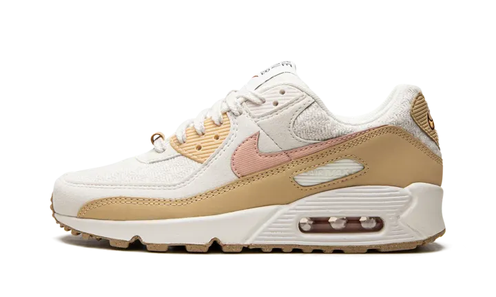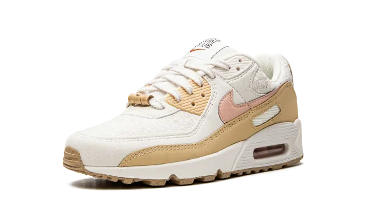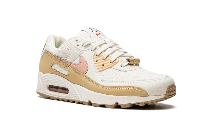 The Women's Nike Air Max 90 "Sun Club" is a women's release of the retro running shoe from the popular colorway collection. The "Sun Club" updates the Air Max 90's timeless design with warm tones and graphics, as it features palm tree detailing on the inner tongue tag, bamboo lace dubraes, and Nike's pinwheel graphic on the Grind outsole. The white textile base is complemented by tonal overlays and a pink Swoosh on either side. "Nike Air" branding is found on the tan heel overlay, and "Nike Sun Club" insignia appears on the tongue tag. The sneaker is complete with a Nike Grind outsole that's made from recycled content. Release date: May 21, 2022