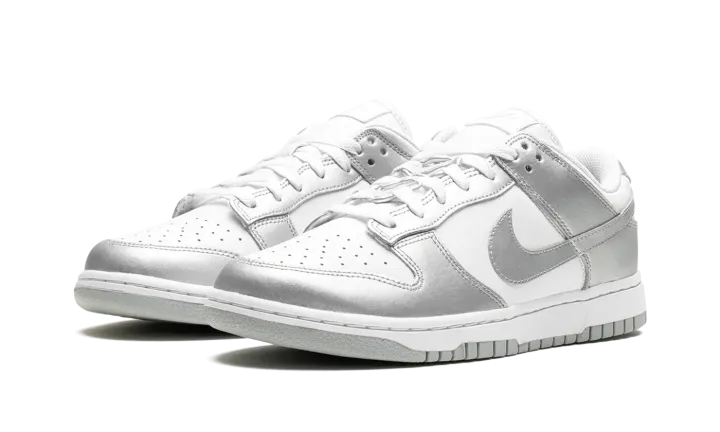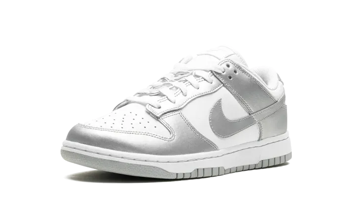 The Nike Dunk Low Metallic Silver (Women's) is a basketball-turned-skateboarding shoe in women's sizing with a metallic color scheme.