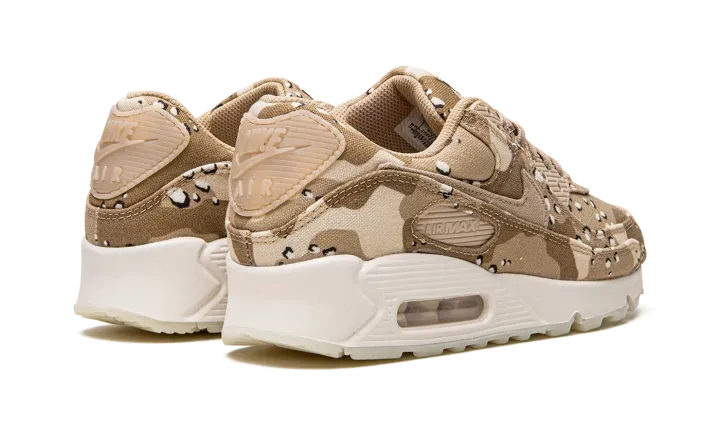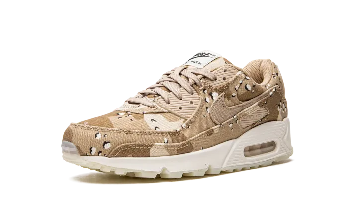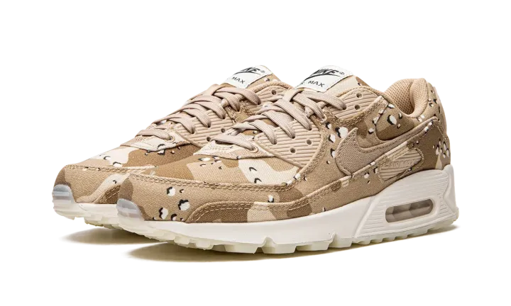 The Women's Nike Air Max 90 "Desert Camo" is a women's-exclusive colorway of the retro performance running shoe with an all-over camouflage look. A September 2022 release by Nike, the Air Max 90 "Desert Camo" features the hard-to-miss camo print in an all-over pattern on its upper, including on the toe, mid-panel, collar, heel, and overlays. A brown canvas Swoosh appears on either side of the shoe and continues the colorway's military vibe. Additional brown accents include a brown "Air Max" branding window on the lateral side of the heel and brown overlay with a "Nike Air" logo on the heel. A Sail midsole with visible Air cushioning and a milky translucent rubber outsole complete the look. Release date: September 21, 2022