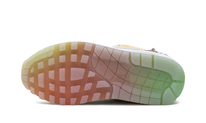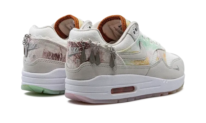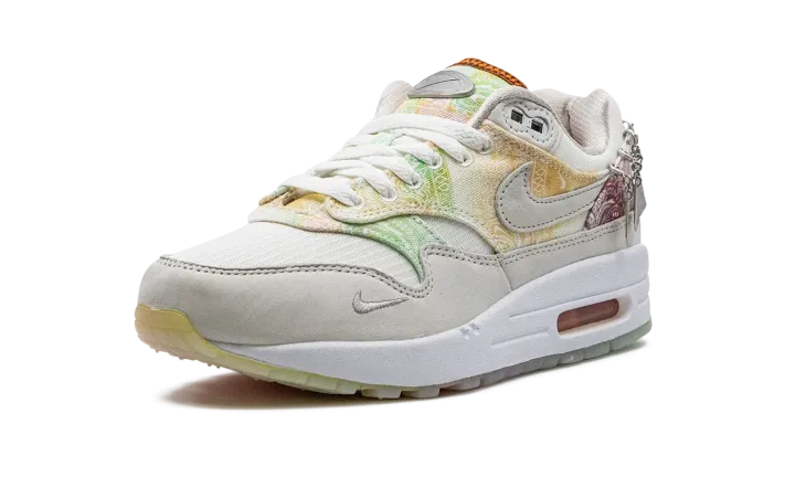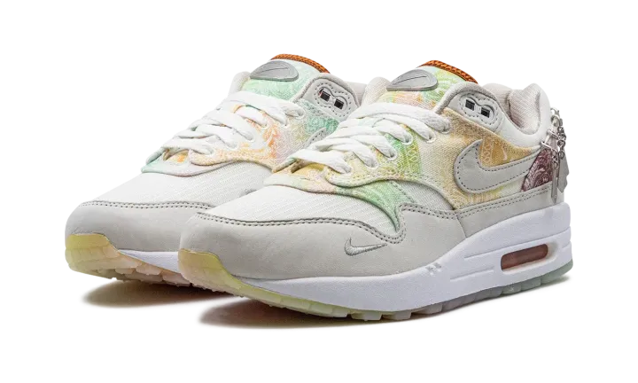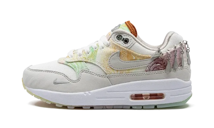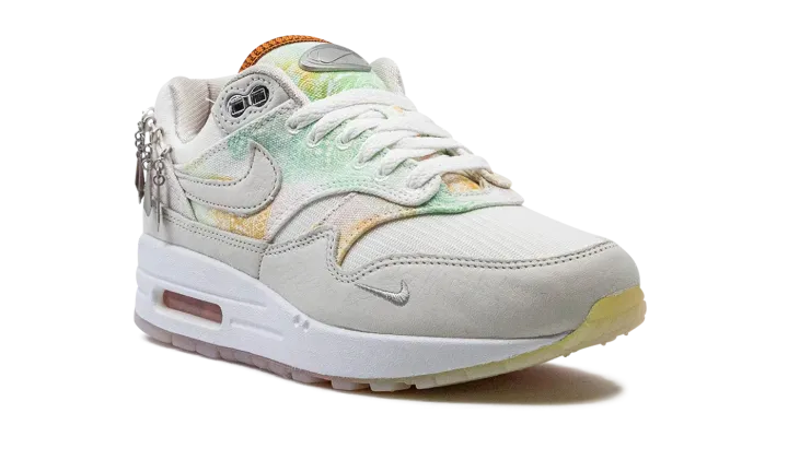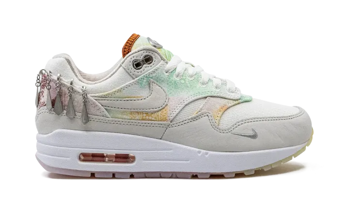 The Women's Nike Air Max 1 "Metal Charms" is a women's-exclusive colorway of the retro running shoe with metallic charms on its design. The unique "Metal Charms" edition features a white mesh base with a cream suede mid-panel overlay with a tie-dye-like pattern. A white leather Swoosh appears on the side. "Nike Air" branding is embroidered on the heel and a Metallic Silver Swoosh emblem is seen on the tongue. Metallic charms are found on the heel. Release date: June 17, 2023