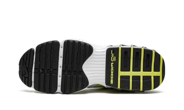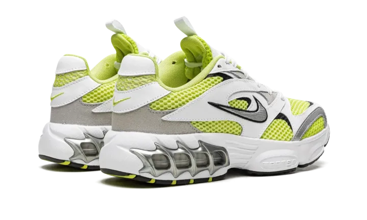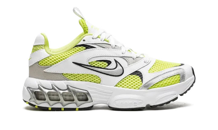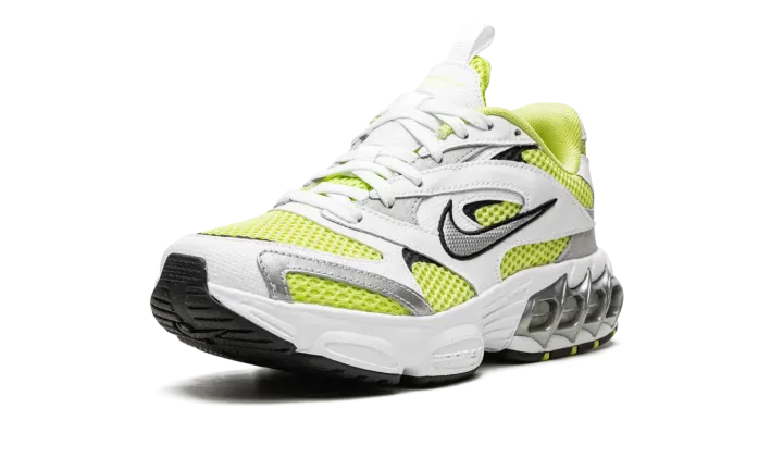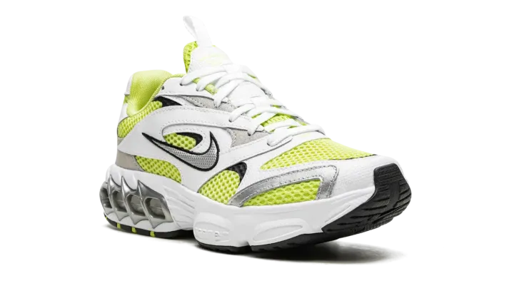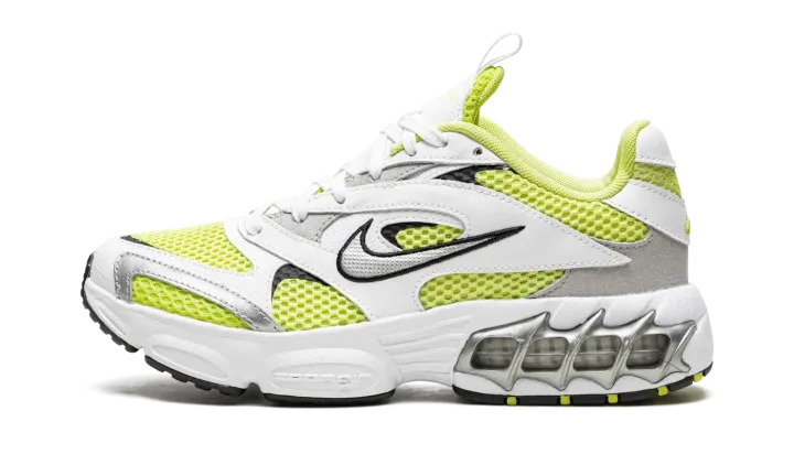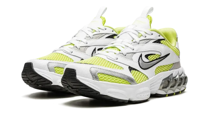 The Women's Nike Zoom Air Fire "Lemon Twist" is a women's version of the retro-inspired lifestyle shoe with an early 2000s vibe. Inspired by running shoes from that era, the Women's Nike Zoom Air Fire is designed in a hard-to-miss way with white leather overlays placed on top of a Lemon Twist mesh base. A silver Swoosh with black trim appears on either side of the shoe. A neon green Swoosh is embroidered on the heel. Underfoot, Nike supplies the model with its signature visible Zoom Air cushioning inside of a chunky foam midsole. A black rubber outsole completes the look.