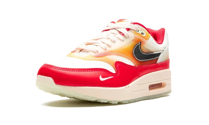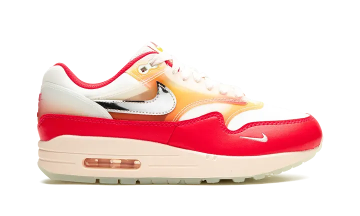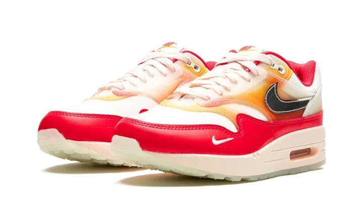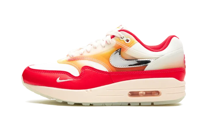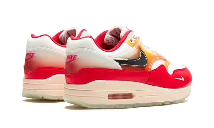 The Women's Nike Air Max 1 "Soft Vinyl" is a women's-exclusive colorway of the retro performance running shoe inspired by the soft vinyl collectible toys that are popular in Japan. Also known as the "Sofvi" colorway, the shoe features a Sail mesh base with punchy Siren Red-colored leather overlays. An orange-and-pink color scheme appears in an ombre-like design on the overlays on the mid-panel and mudguard. Chrome Swoosh branding and a graphic sockliner enhance the look, as do the glow-in-the-dark elements throughout the design. Release date: August 30, 2023