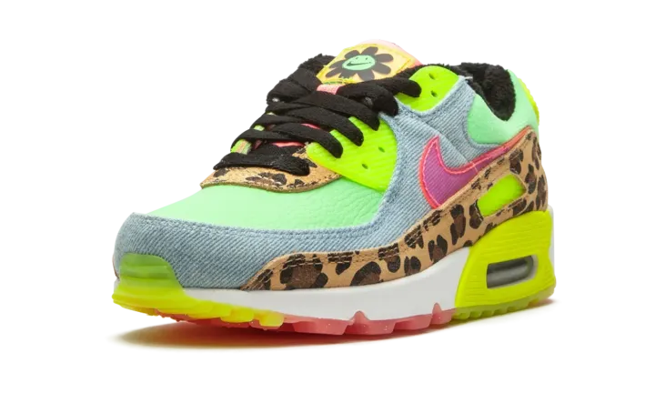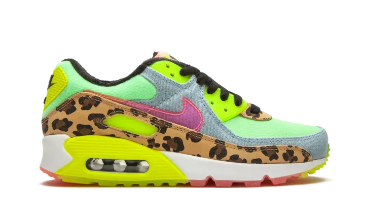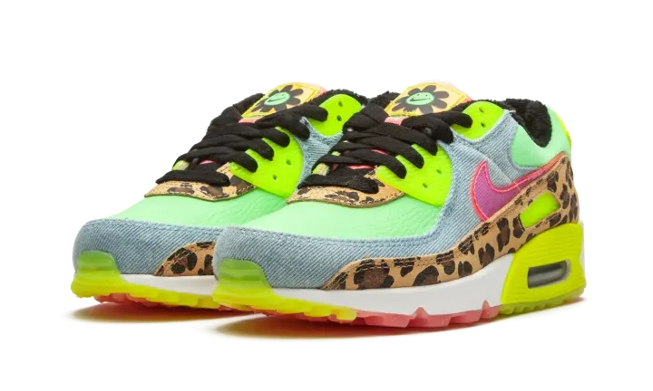 The Women's Nike Air Max 90 LX "Denim Leopard Print" is a wild colorway of the retro performance running shoe that blends contrasting colors and materials to tell its story. Released by Nike to honor the Air Max 90's 30-year anniversary, the "Denim Leopard Print" is certainly one of the more unique looks ever for the stately low-top shoe. Calling to mind '90s rave culture, a leopard pattern appears on the mudguard and lower eyelets. A washed light denim material can be found on the toe cap, mid-panel, and collar. Nike places a translucent pink Swoosh on the mid-panel for additional party-inspired flavoring. Other details include a Neon "Air Max" branding window and heel tab with black "Nike Air" detailing, a lime green leather base, and smiling floral character on the yellow translucent tongue tag. While the "Denim Leopard Print" is a progression in terms of its use of colors and materials, the model does retain its traditional clear Air unit in the heel.