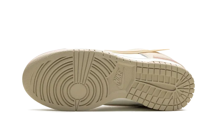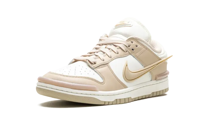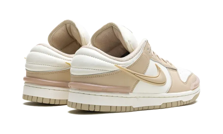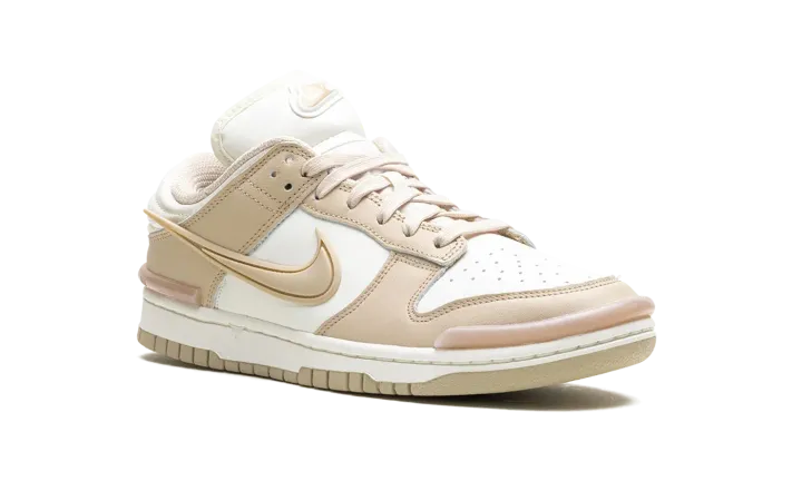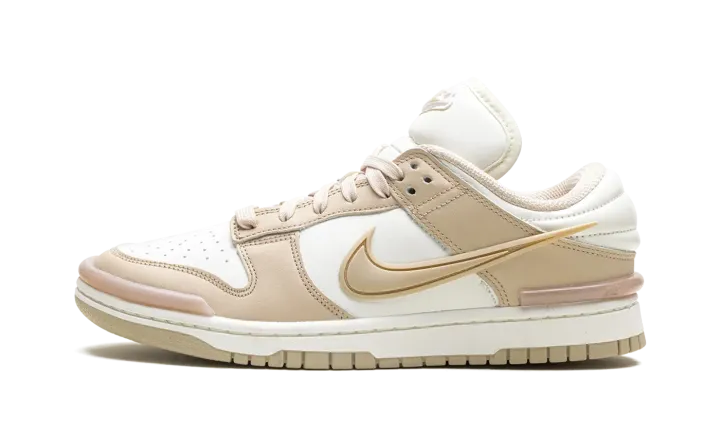 The Women's Nike Dunk Low Twist "Sanddrift" is a women's-exclusive colorway of the retro sneaker with a contemporary spin. The Dunk Low Twist modifies the Dunk's design with unique details, including bumpers on the toe and heel and a partially detached Swoosh. On the "Sanddrift," the shoe has a white leather base with Sanddrift, or tan, leather overlay panels. Two plastic "bumpers" are found on the front and back of the shoe above the rubber midsole. A puffy Nike logo is found on the tongue.
