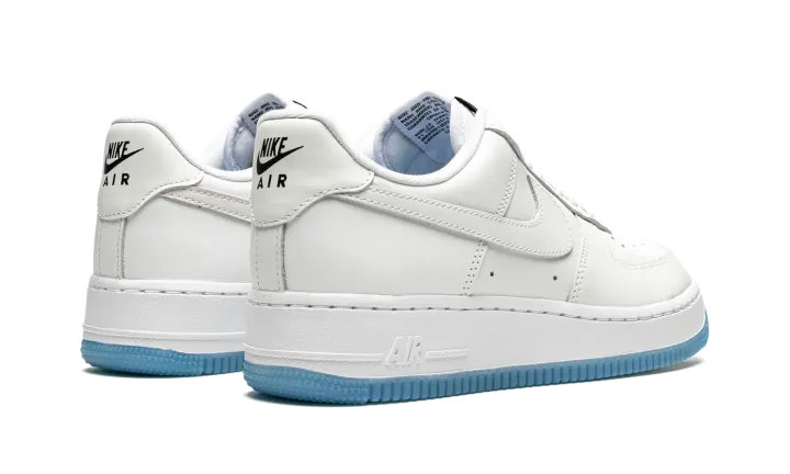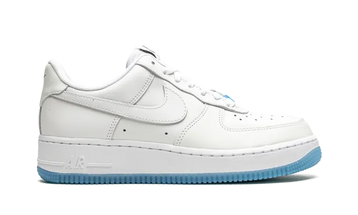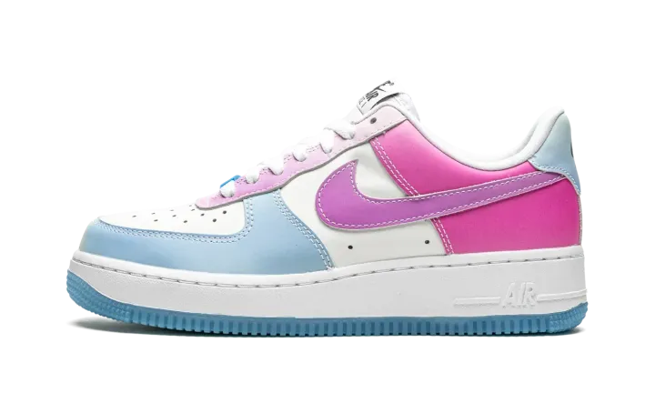 The Women's Nike Air Force 1 Low "UV Reactive" is a women's exclusive look for the retro basketball shoe that features photochromic inks that give the shoe a new multicolor look when exposed to UV light. It appears as a variation of the Air Force 1's "White on White" colorway when not in contact with UV rays. When exposed, the forefoot, eyelets, mid-panel, collar, and heel adjust into various shades of pastel colors. Specifically, the perforated toe and mid-panel turn yellow while the forefoot, eyelets, collar, and Swoosh transition from white to light blue, purple, and pink, respectively. A white midsole is paired with an icy translucent blue outsole. A Silicone Swoosh hang tag accompanies the shoe.