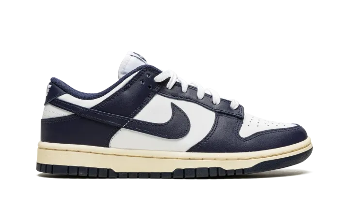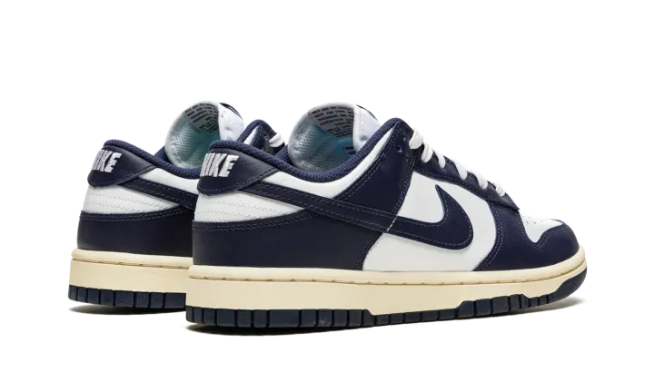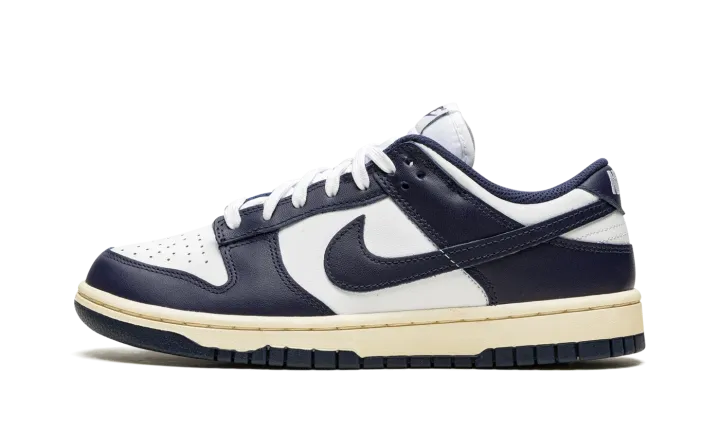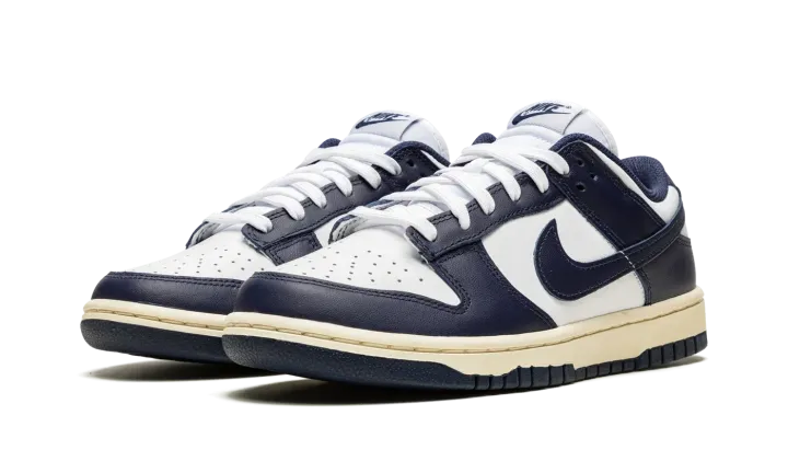 The Nike Dunk Low "Vintage Navy" is a classic two-tone, white-and-navy colorway for the retro basketball shoe with a decidedly throwback vibe. The "Vintage Navy" edition of the Dunk Low calls back to original styles found in the "Be True to Your School" pack of college basketball-inspired colorways from 1985. The shoe's upper features a white leather base with contrasting Vintage Navy-colored leather overlays and Swoosh branding. White "Nike" branding is embroidered on the heel, and navy "Nike" and Swoosh detailing is found on the tongue tag. The shoe rides on a cream-colored rubber midsole that gives the shoe a vintage look. Underfoot, a Vintage Navy outsole completes the look. Release date: March 4, 2022