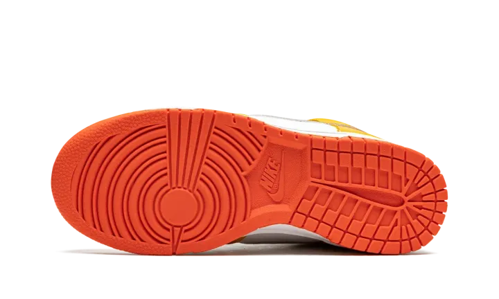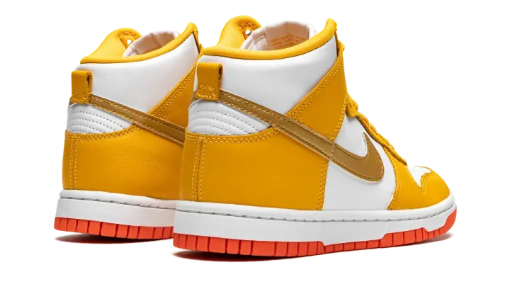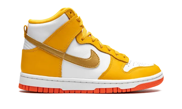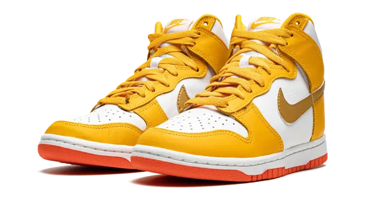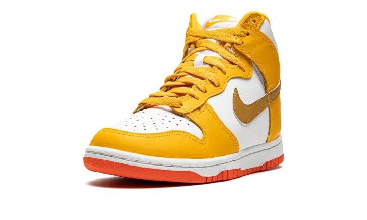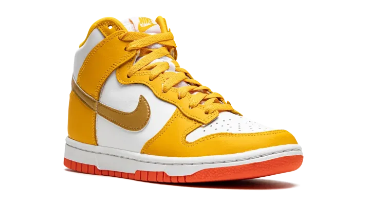 The Women's Nike Dunk High "University Gold" is a women's version of the old school basketball shoe in a vibrant colorway. The "University Gold" is complete with a white leather base with University Gold-colored leather overlays on the forefoot, eyelets, collar, and heel. A Metallic Gold leather Swoosh is found on the sides and yellow "Nike" and Swoosh branding appears on the white nylon tongue tag on the white mesh tongue. University Gold laces contrast the look. A white midsole is paired with an orange rubber outsole. Release date: November 27, 2021
