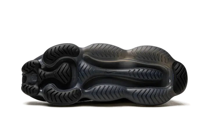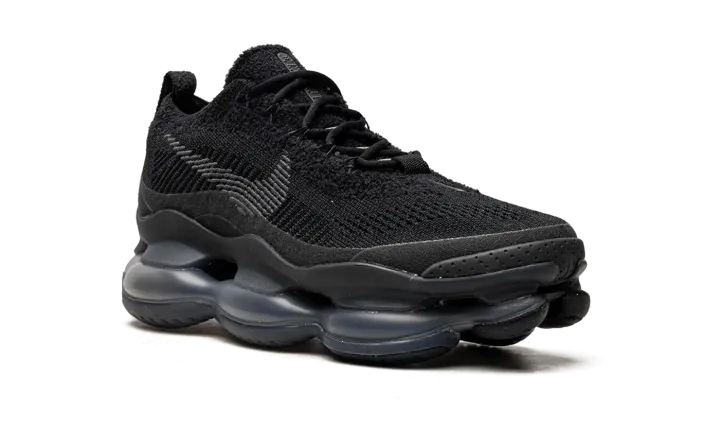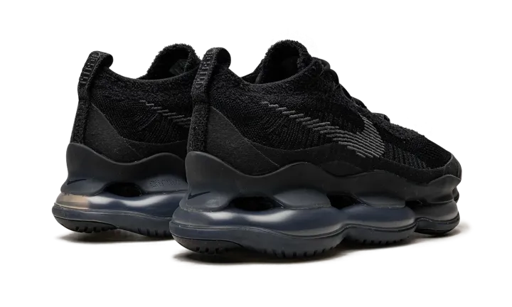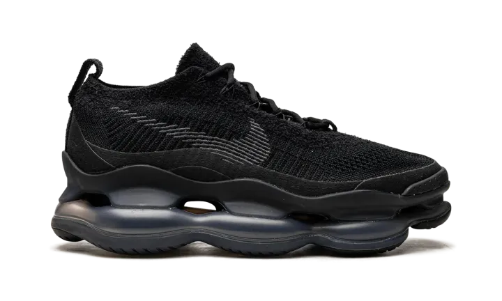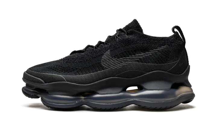 The Women's Nike Air Max Scorpion Flyknit "Triple Black" is a women's-exclusive colorway of the contemporary-looking lifestyle shoe with a monochromatic black design. The Air Max Scorpion Flyknit in the "Triple Black" makeup features a woven black Flyknit upper with a grey Swoosh on the sides. In spite of its sock-like appearance, the shoe is complete with a traditional lacing setup. The shoe is mounted on an exaggerated midsole with oversized Air bubbles that gives the silhouette a platform-style appearance.