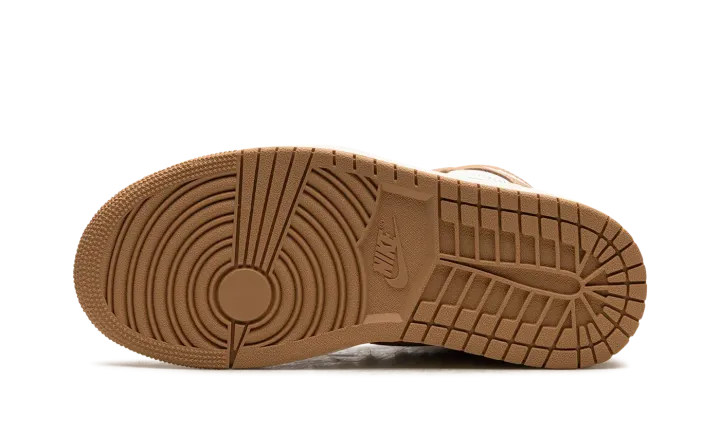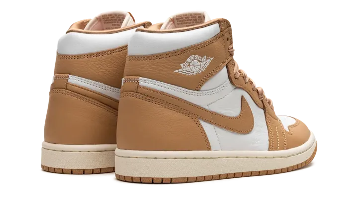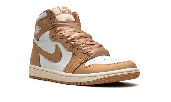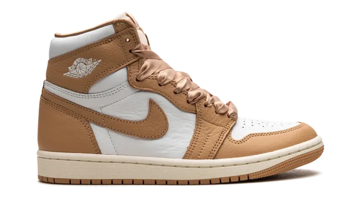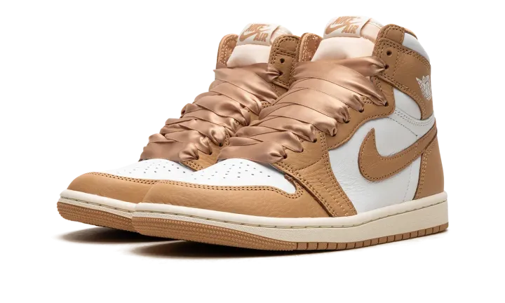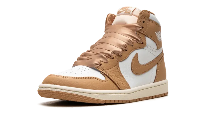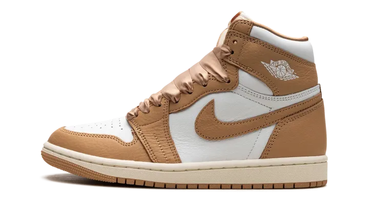 The Women's Air Jordan 1 Retro High OG "Praline" is a women's-exclusive colorway of the retro basketball sneaker inspired by luxury handbags. The striking design features a white leather base with tan leather overlays and a tan leather Swoosh on each side. Classic "Wings" branding appears on the collar and "Nike Air" and Swoosh logos are found on the tongue tag. The shoe's satin-like ribbon-style laces are inspired by details on a handbag. Release date: September 13, 2023