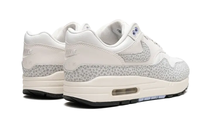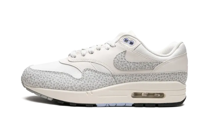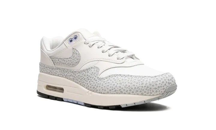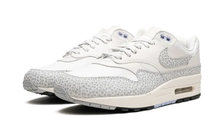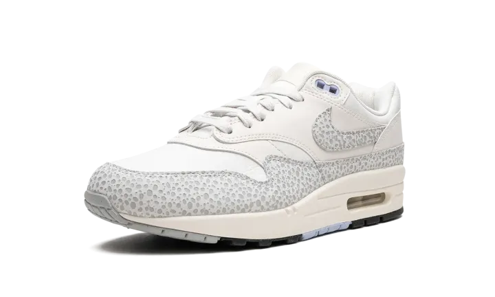 The Women's Nike Air Max 1 "Summit White" is a women's-exclusive colorway of the retro running shoe with safari-inspired accents. The clean, versatile "Summit White" edition of the Air Max 1 features a Summit White leather base with tonal leather overlays on the forefoot, eyelets, mid-panel, and heel. A grey safari print appears on the leather mudguard and on the Swoosh branding found on either side of the shoe. Classic "Nike Air" insignia is embroidered on the heel and "Nike Air Max" branding is printed on the tongue tag. Underfoot, a white foam midsole with visible Air cushioning completes the look. Release date: March 3, 2023