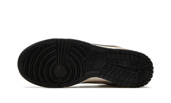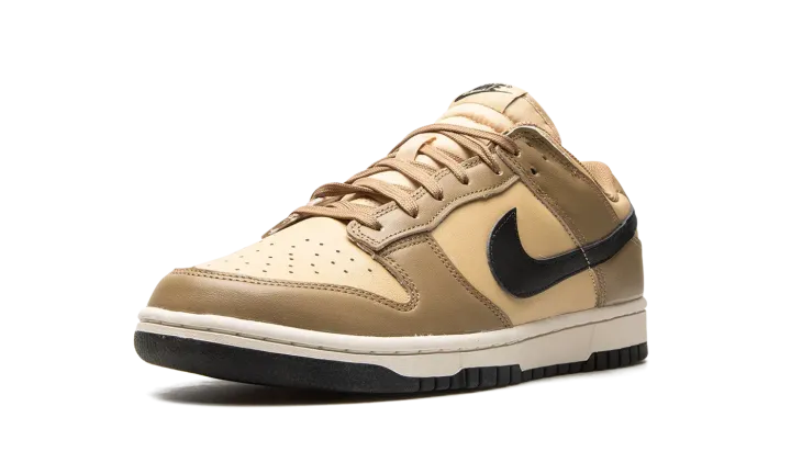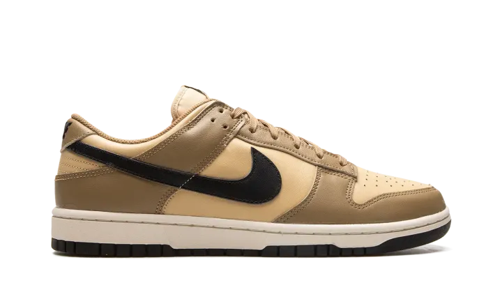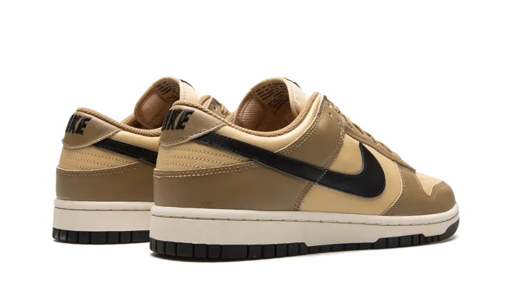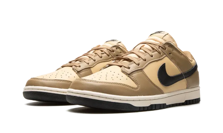 The Women's Nike Dunk Low "Dark Driftwood" is a women's-exclusive colorway of the retro basketball and lifestyle shoe with a unique combination of tan and brown tones. The "Dark Driftwood" features a tan leather base with Dark Driftwood leather overlays. A black leather Swoosh logo appears on both sides of the shoe. Additional branding includes embroidered black "Nike" detailing on the heel and a printed "Nike" logo on the tongue tag. The cream-colored rubber midsole gives the shoe a decidedly retro vibe. Underfoot, a black outsole completes the look. Release date: November 22, 2022