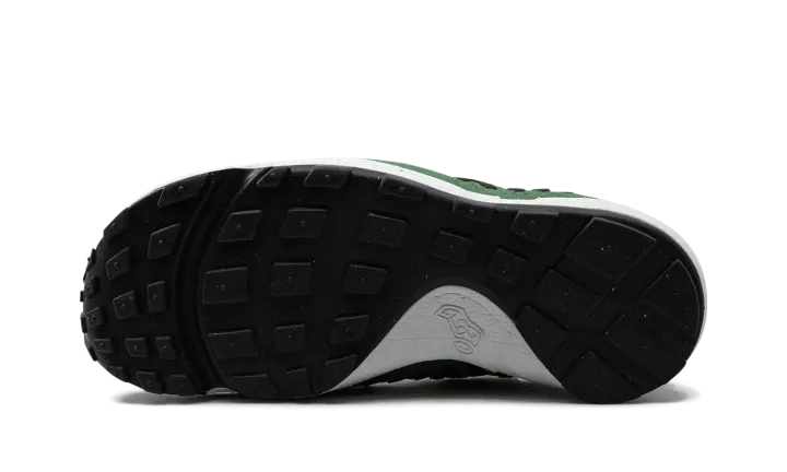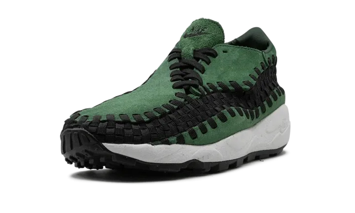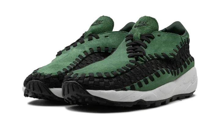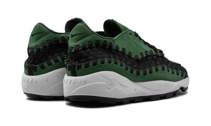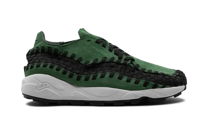 The Women's Nike Air Footscape Woven "Fir" is a women's-exclusive colorway of the sneaker that combines elements from the Nike Air Footscape and Nike Air Woven with green details. The Air Footscape Woven is an attention-grabbing shoe, as it features a unique asymmetrical lacing system. The upper has a Fir, or green-colored suede construction with a black woven laces to match the weave found throughout the shoe. Classic "Nike" branding appears on the tongue. Underfoot, a white midsole and black rubber outsole complete the bold design.
