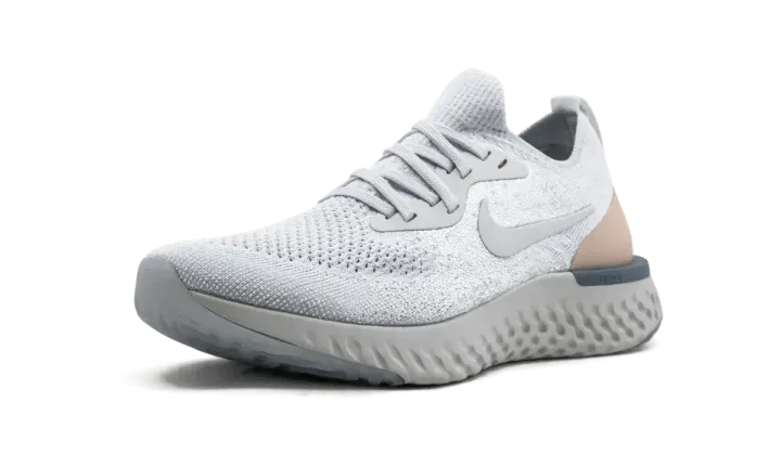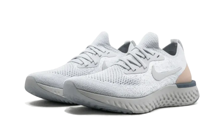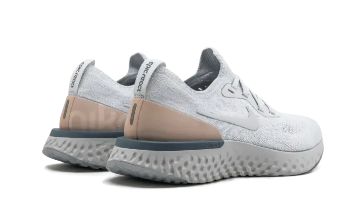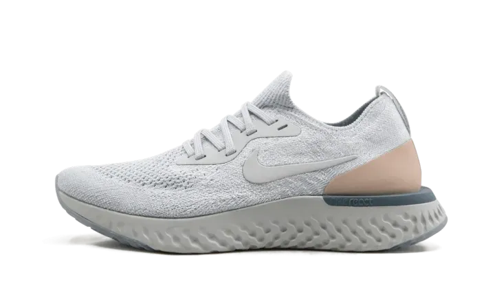 The women's Nike Epic React Flyknit combines Nike's latest running innovations with fashion-forward color blocking. The women's running shoe has ridiculously responsive foam cushioning that is both durable and soft — giving wearers that "springy" step they need for long or short runs. Subdued with a neutral palette, this model comes with a pale platinum grey upper atop a darker grey sole unit. A tan color accents the heel, and the outsole of the Nike Epic React Flyknit has an icy gradient scheme.