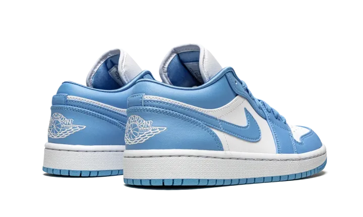 The Air Jordan 1 Low "UNC" is the low-top version of Michael Jordan's first signature shoe that sports the team uniform colors of the North Carolina Tar Heels. Both sneaker fans and collectors routinely rank the "UNC" color scheme as one of the greatest looks in Air Jordan history. This Spring 2020 release features a white leather mid-panel and toe. Baby blue leather overlays on the forefoot, mid-foot, and heel provide contrasting against the neutral base. A University Blue leather Swoosh is found on each side, and a white embroidered Wings logo graces the heel. Jordan Brand finishes off the look with an embroidered blue Jumpman on the white nylon tongue and "23" detailing on the lace stay. Release date: Spring 2020.