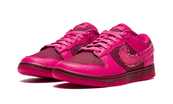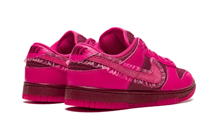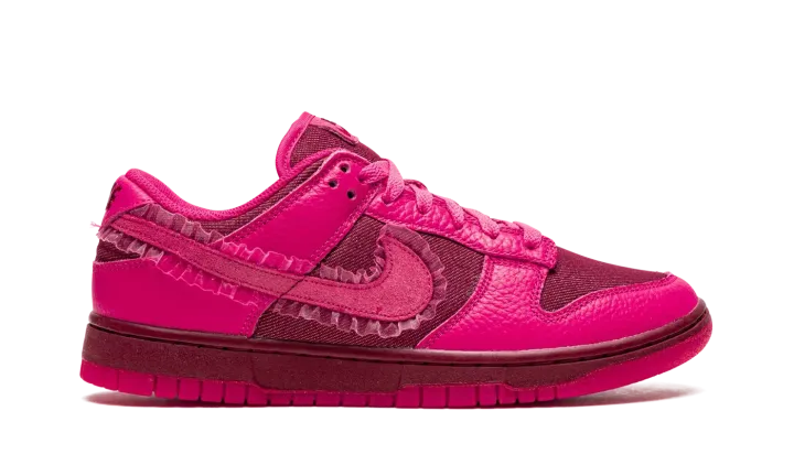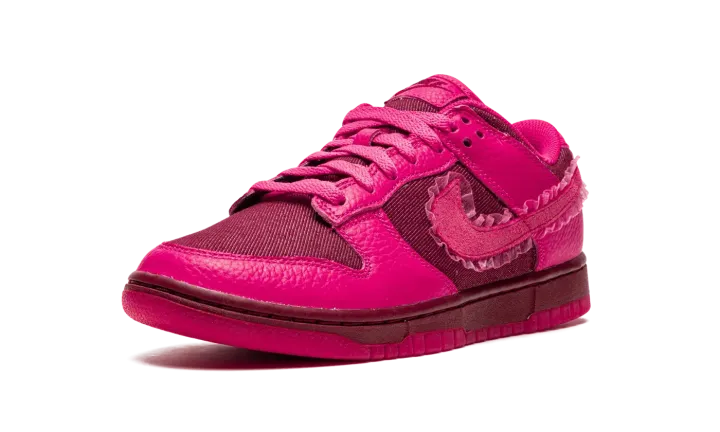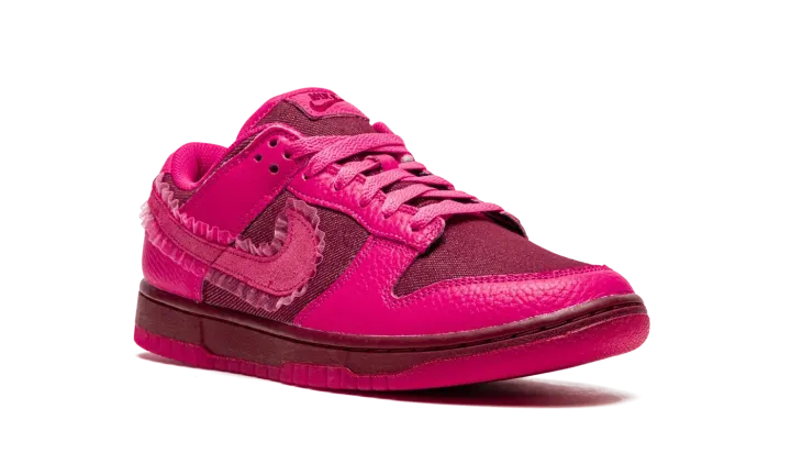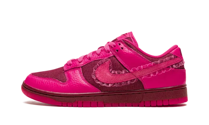 The Women's Nike Dunk Low "Valentine's Day" is a women's-exclusive release of the classic sneaker in a unique colorway that pays homage to Valentine's Day. A February 2022 release, the "Valentine's Day" version of the Dunk Low succeeds popular Dunks that have shown love to the holiday before it, including StrangeLove Skateboards' collaboration with the Nike SB Dunk in 2020. This "Valentine's Day" Dunk features a maroon canvas base with pink tumbled leather overlays. A pink suede Swoosh can be found on either side of the shoe and pink "Nike" branding is stitched onto the heel. Adding a fun, creative look to the shoe, sheer underlays appear beneath the Swoosh logos on the mid-panel. A two-tone, maroon midsole and pink rubber outsole complete the festive design. Release date: February 12, 2022