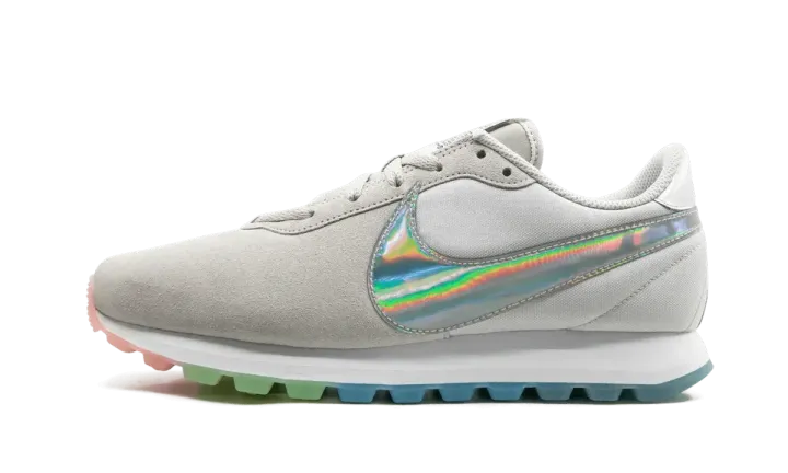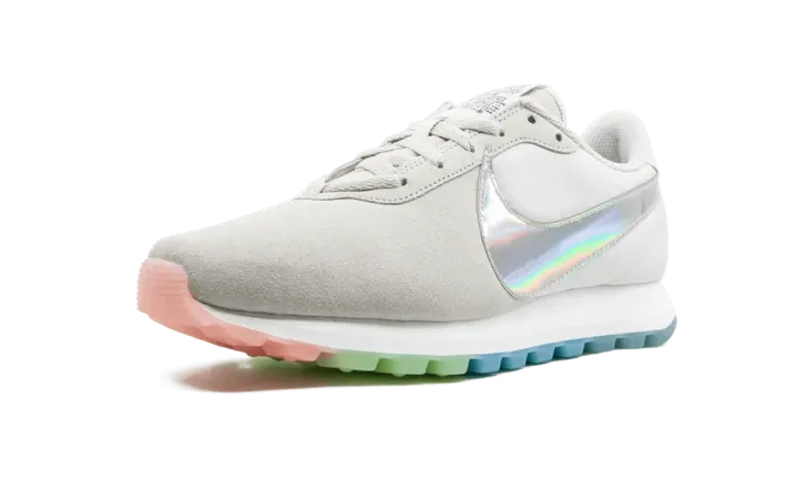The Nike Pre Love O.X. women's shoe pays its respects to Nike running legend Steve Prefontaine. The two-piece nylon-nubuck upper construction has a shape similar to the Air Pegasus 83, and an oversized holographic midfoot Swoosh brings in distinct design. An inside-out Nike retro tongue tag displays care instructions for the shoe. "Nike" and "Swoosh" adorn the heels and the tan-colored Nike Pre Love O.X. sits atop a rainbow gradient sole that features a whimsical combo of pink, green, and blue.