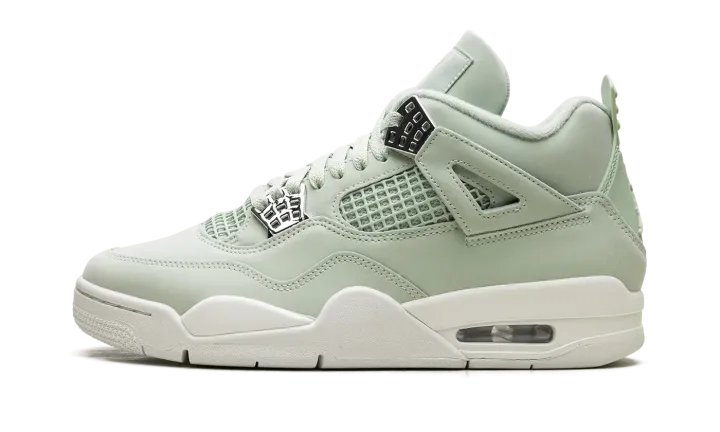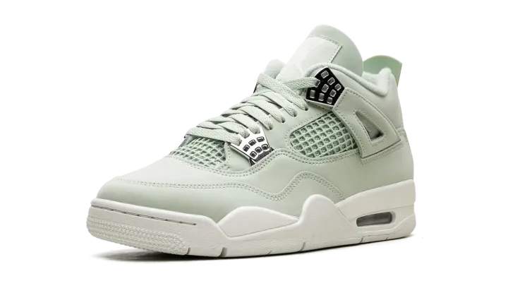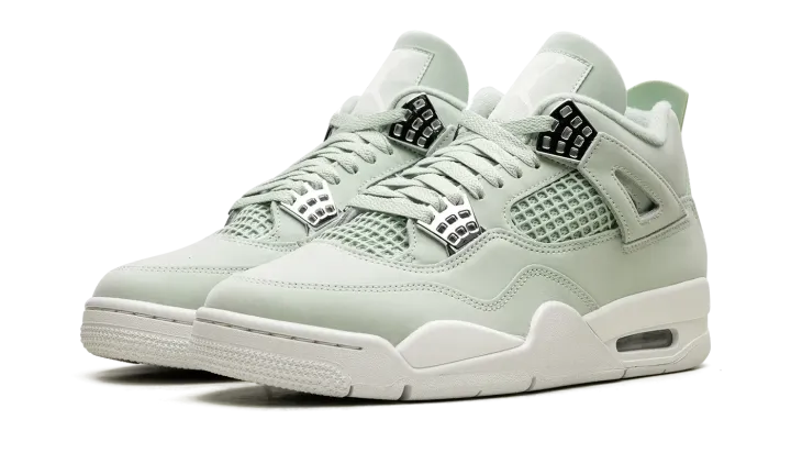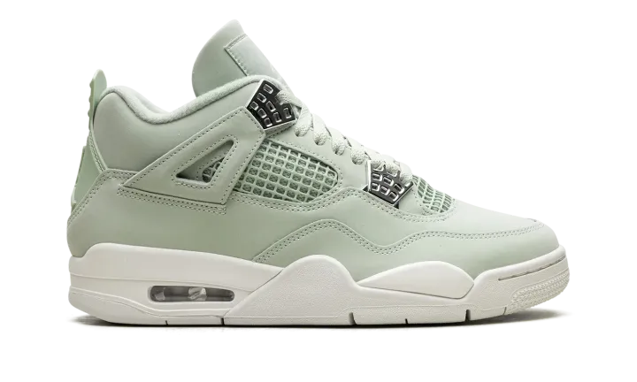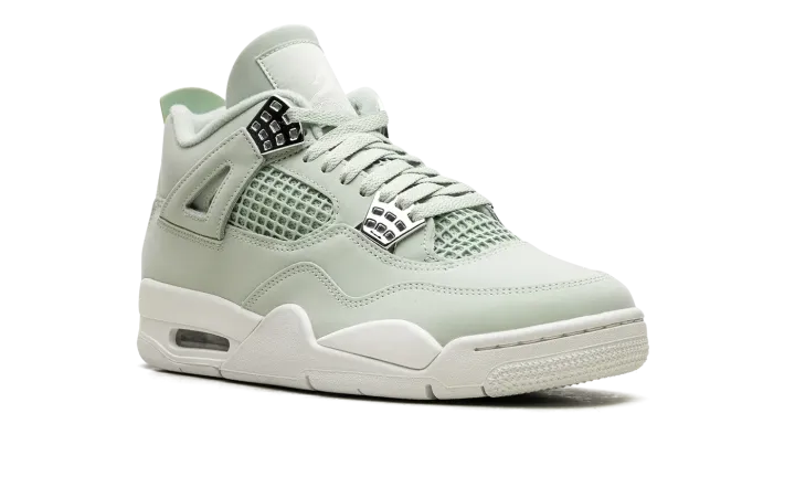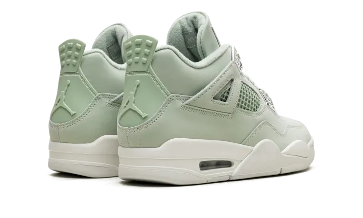 The Air Jordan 4 "Seafoam" is a women's colorway of Michael Jordan's fourth signature shoe. This Jordan 4 has a clean, light green upper that is balanced with a white midsole. The "Seafoam" AJ4 incorporates the signature design details of the Air Jordan 4, including the mesh panels and wings on the side. A tonal Jumpman logo appears on the heel.