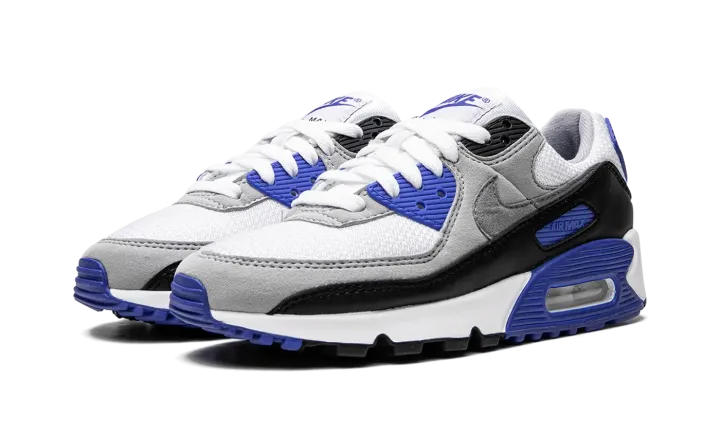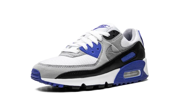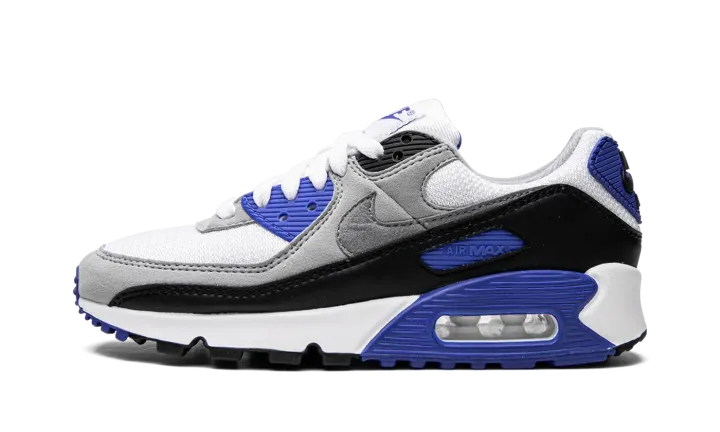 The Women's Nike Air Max 90 "Hyper Royal" is the women's sizing of the "remastered" silhouette that was released in Spring 2020. Featuring a slimmed down mesh toe box and a return to the materials used on early versions of the shoe, this Air Max 90 Recrafted sports a light grey suede overlay on the toe and mid-panel. A tonal Swoosh covers the mid-panel and smooth black leather dots the mudguard. Nike opts for a Hyper Blue "Air Max" branding window on the heel and black "Nike Air" detailing on the blue heel overlay. The look is finished off with visible Air cushioning in the heel, which provides optimal all-day comfort.