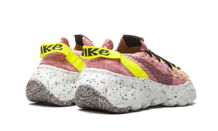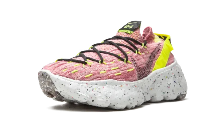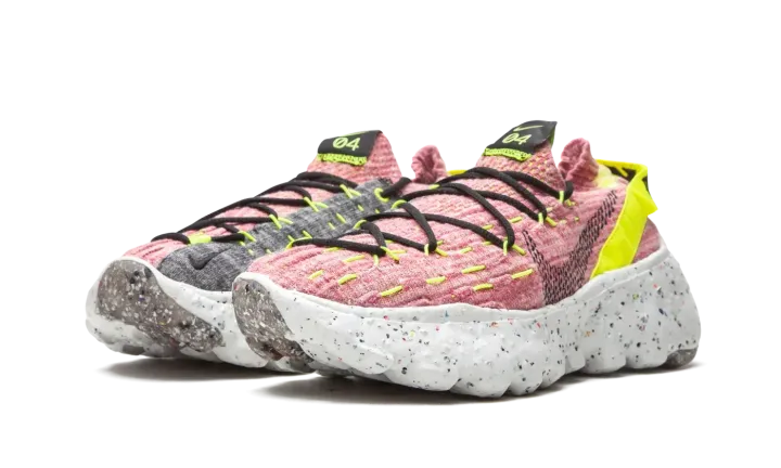 The Women's Nike Space Hippie 04 "Lemon Venom" is a women's exclusive colorway of the sustainable shoe from Nike's "Space Hippie" campaign. The forward-thinking collection is centered around the idea of living on Mars with few resupply missions. Each model in Nike's "Space Hippie" line is built from "space junk," otherwise known as leftover materials from Nike's cutting room floor. The recycled scraps form the pink and grey woven upper and speckled FoamX midsole. A black dotted Swoosh appears on the mid-panel and futuristic "Nike" text graces the Lemon Venom nylon heel tab. Despite its sock-like appearance, a traditional lacing system can be found on the top of the shoe and provides the wearer with even more stability. Nike rounds out the look of the Space Hippie 04 by placing "space junk" within the foam outsole. Release date: August 20, 2020.