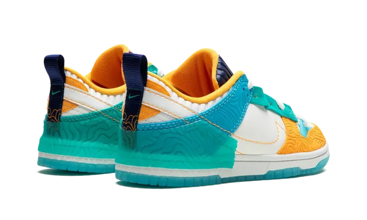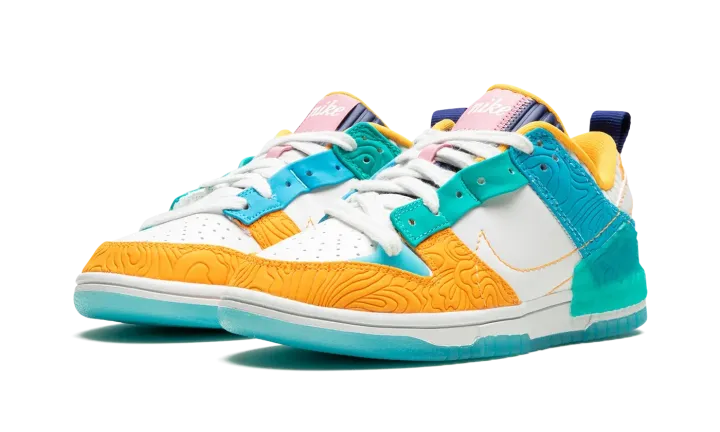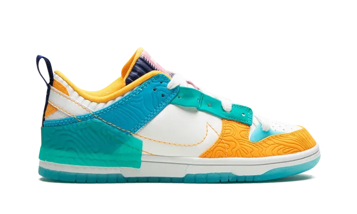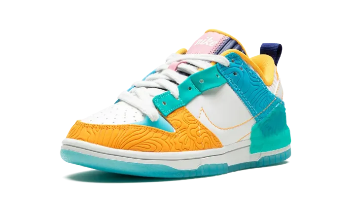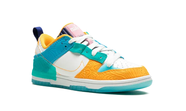 The Serena Williams Design Crew x Women's Nike Dunk Low Disrupt 2 is a bold take on the Dunk by the tennis star's design team. The colorway features a white leather base with a debossed pattern on the Sundial (orange) leather toe panel and Baltic Blue leather heel overlay. The eyelet panels have a mismatched color scheme while a ribbed collar and stitched Swoosh on each side further add to the unique design. Release date: August 31, 2023