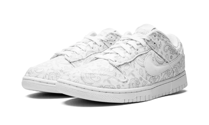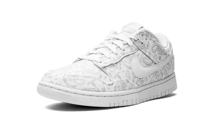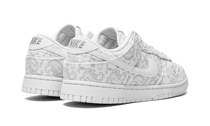 The Women's Nike Dunk Low "White Paisley" is a women's-exclusive colorway of the retro basketball shoe that features an all-over paisley print design. The "Paisley" trend was kicked into overdrive in 2022 when shoes like the Dunk, Nike Air Force 1, and many others were released in colorways with the bandana-inspired print on their design. Here, the "White Paisley" features the popular design in question in an all-over style that is both eye-catching and relatively subdued at the same time. The "White Paisley" is constructed in white canvas with a low-contrast light grey paisley pattern found across the upper. A white leather Swoosh appears on either side of the shoe. Additional branding includes a Metallic Silver embroidered "Nike" logo on the heel, and grey "Nike" and Swoosh logos on the tongue tag. The shoe rests on a white rubber sole. Release date: May 1, 2022