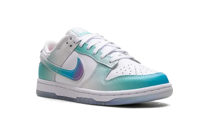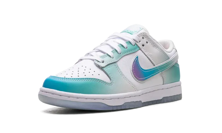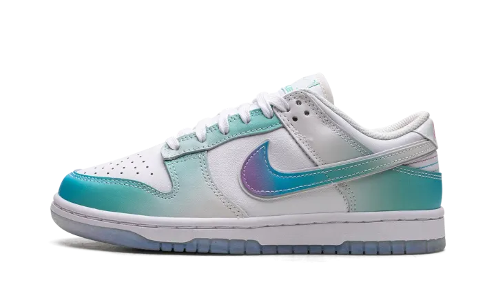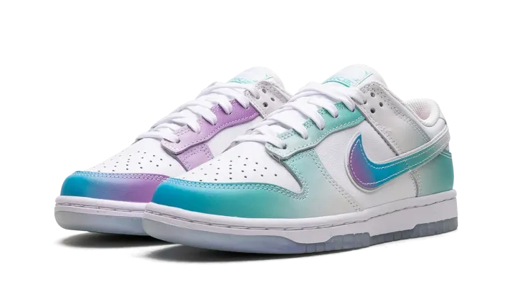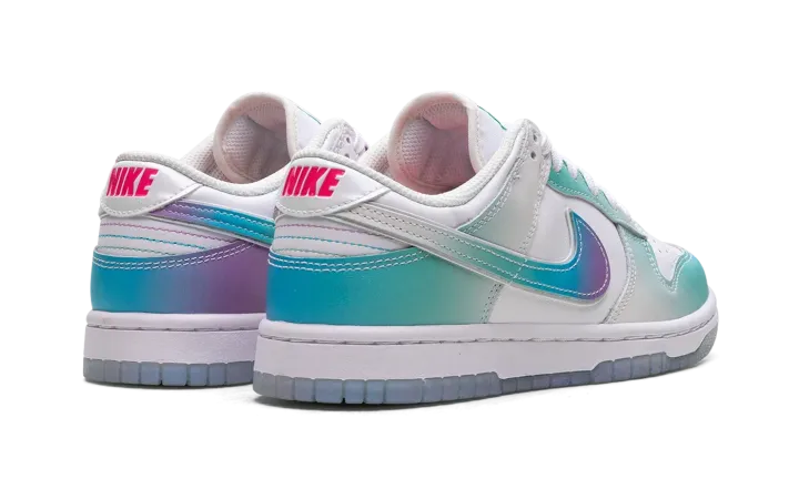 The Women's Nike Dunk Low "Unlock Your Space" is a women's-exclusive colorway of the retro basketball shoe with gradient details. From a collection of "Unlock Your Space" colorways, the Dunk Low of the same name features a white leather base with colorful gradient detailing on the overlay panels and Swoosh. Classic "Nike" branding can be found on both the tongue and heel. A white rubber midsole and icy blue translucent rubber outsole complete the look. Release date: June 15, 2023