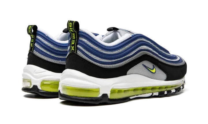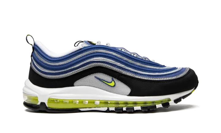 The Nike Air Max 97 "Atlantic Blue/Voltage Yellow" is a colorway of the retro performance running shoe that combines its original "Atlantic Blue" and "Neon" colorways. In 2017, Nike reissued the Air Max 97's "Atlantic Blue" and "Neon" colorways for the models 20th anniversary, and here, the Swoosh combines both classic styles into one cohesive colorway for the shoe's 25th anniversary. The "Atlantic Blue/Voltage Yellow" has blue reflective leather panels layered over a Metallic Silver mesh base on the upper. A black mudguard contrasts the look. A Voltage Yellow Swoosh is embroidered on either side above the white foam midsole. Additional neon yellow accents can be found on the Swoosh on the tongue and on the black nylon heel tab. The full-length visible Air cushioning system within the white foam midsole is consistent with the original design of the Air Max 97. Release date: August 23, 2022