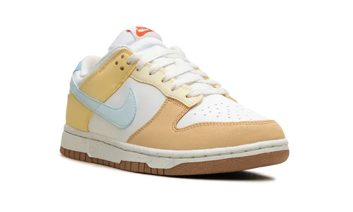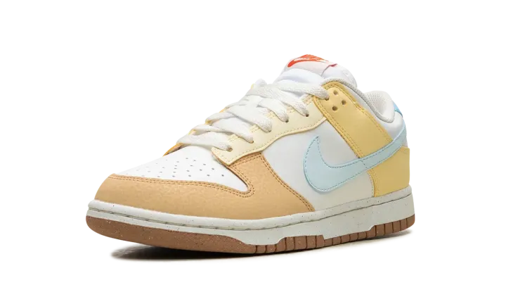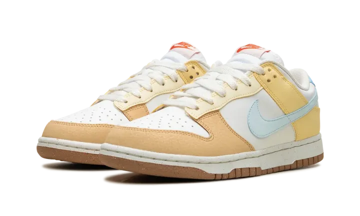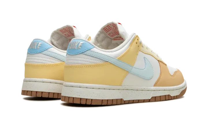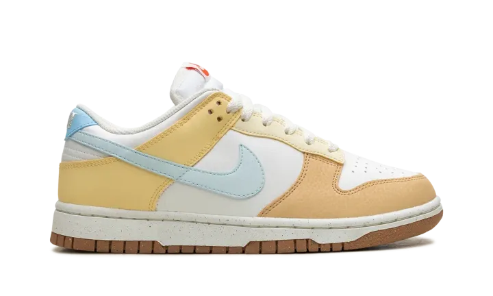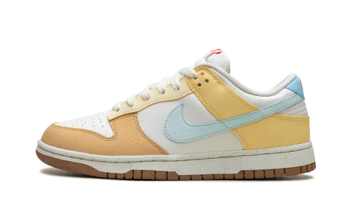 The Women's Nike Dunk Low Next Nature "Soft Yellow" is a women's-exclusive colorway of the eco-friendly sneaker with yellow details. On the "Soft Yellow" Dunk Low Next Nature, the shoe has a Summit White leather base and Soft Yellow and Alabaster-colored leather overlays. An Aquarius Blue leather Swoosh branding appears on the sides. The hue also appears on the leather heel tab with classic "Nike" embroidery. Underfoot, the outsole is constructed of recycled Nike Grind material. Release date: March 5, 2024