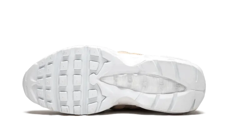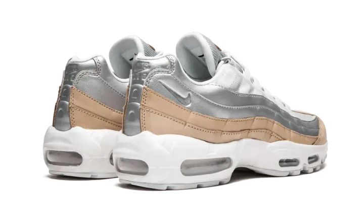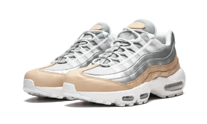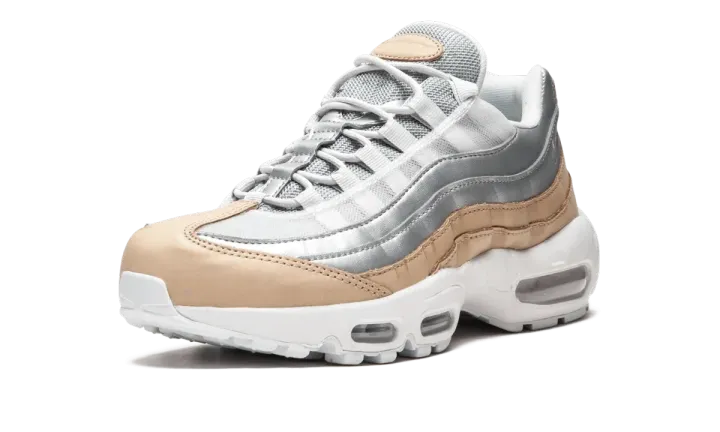 The Nike Air Max 95 is one of the most iconic silhouettes that the brand has ever released. Appearing in multiple color schemes and iterations since its debut in 1995, this women's release is an example of a more elevated take on the retro Nike runner. The Nike Air Max 95 SE PRM is dressed in a metallic silver upper. The futuristic look is paired with vachetta tan leather on the bottom two panels of the upper, and the toe and tongue branding. The unique combination is placed atop a clean white midsole with full-length Air Max cushioning for additional comfort.