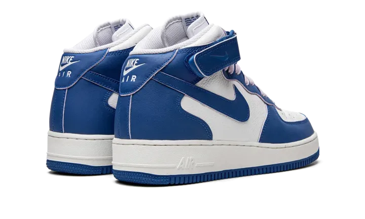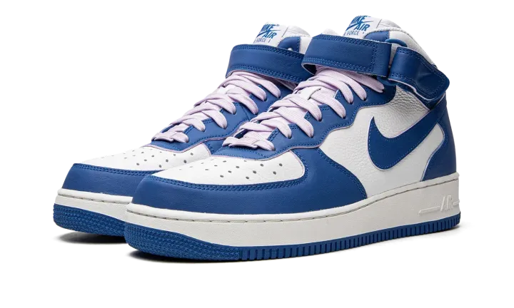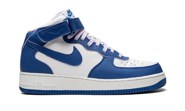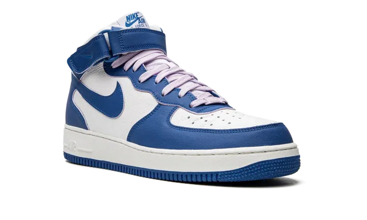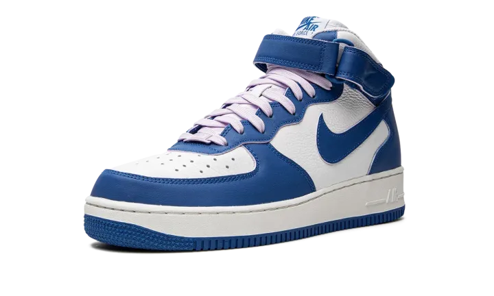 The Women's Nike Air Force 1 Mid "Military Blue" is a women's-only colorway of the lifestyle shoe with a sporty two-tone design. The "Military Blue" dons a white leather base with contrasting Military Blue leather overlays and Swoosh branding. The blue hue also appears on the adjustable ankle strap, and on the "Nike Air Force 1" detailing found on the tongue tag. Nike switches up the look of the design with soft lavender-colored laces. Finishing touches include a white midsole with tonal "Air" branding on the heel, and a Military Blue rubber outsole. Release date: August 30, 2022