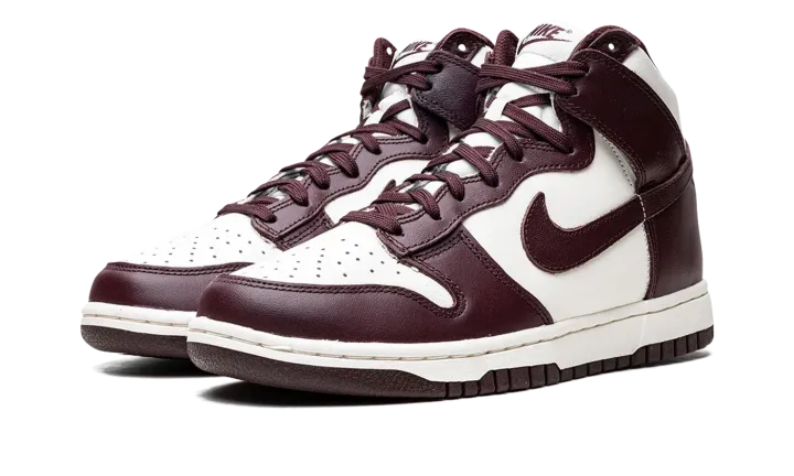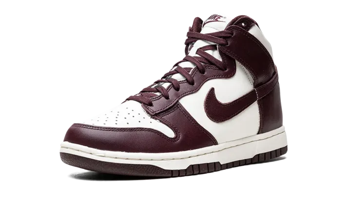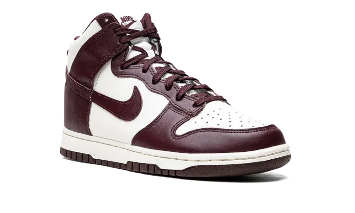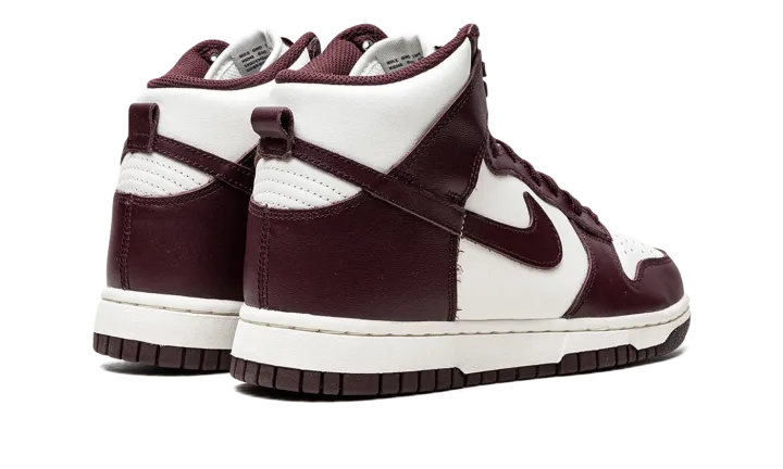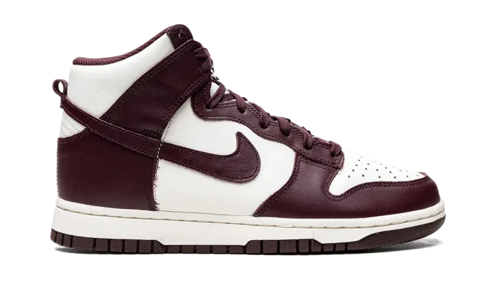 The Nike Dunk High "Burgundy Crush" is a timeless look for the vintage basketball and lifestyle shoe with a two-tone appearance. In the "Burgundy Crush" colorway, this Dunk High features a retro-inspired look with its Sail leather base and contrasting Burgundy Crush leather overlays and Swoosh branding. Both the "Nike" and Swoosh detailing on the tongue are also designed in Burgundy Crush, as are the laces and the leather heel tab on the back of the shoe. A cream rubber midsole and burgundy outsole complete the look. Release date: November 22, 2022