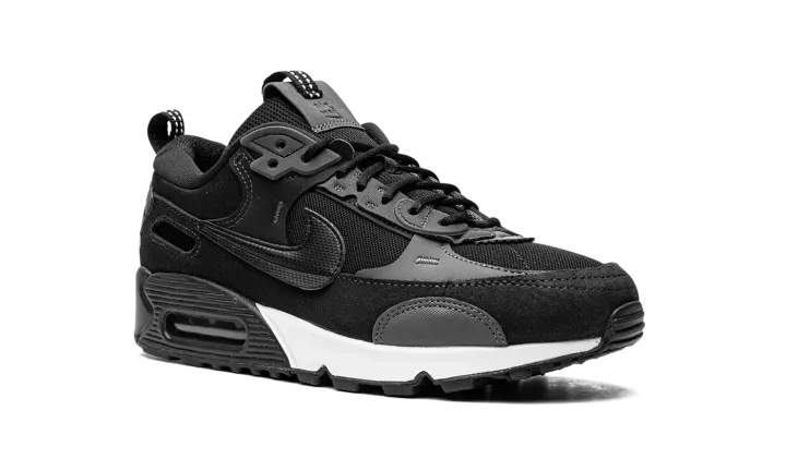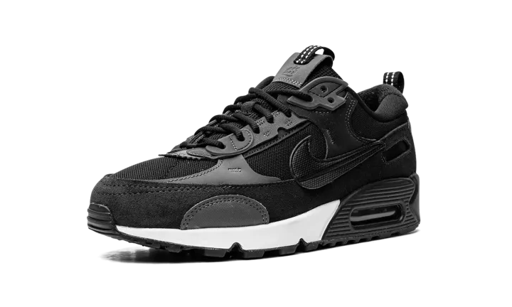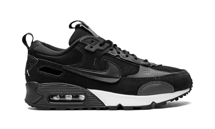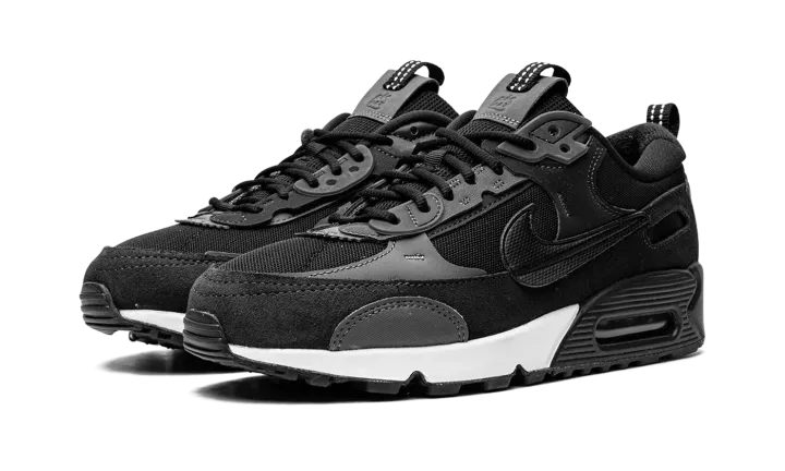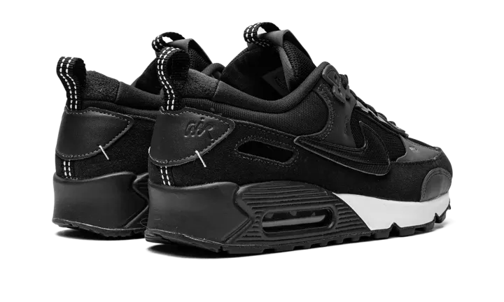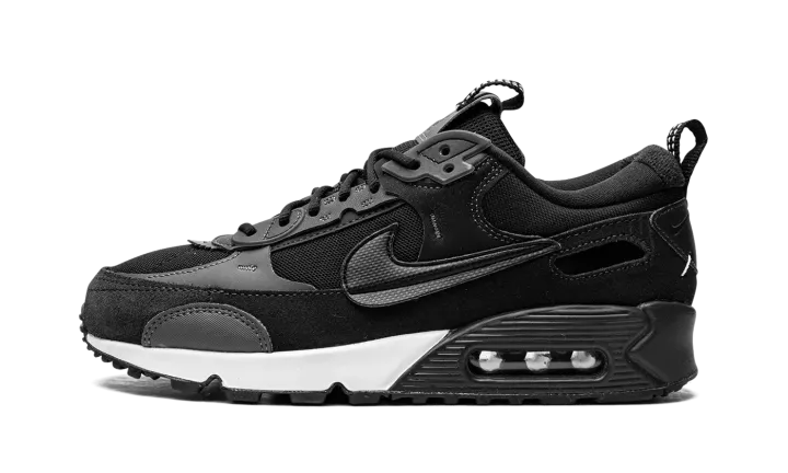 The Women's Nike Air Max 90 Futura "Black" is a women's-exclusive colorway of the future-forward version of the retro performance running shoe. The Air Max 90 Futura injects the classic sneaker with a contemporary edge, as it updates its design with a new arrangement of overlays, a modified Swoosh logo, and more. The shoe features a black textile base with tonal leather overlays on the forefoot and eyelets. A dark grey, oversized Swoosh is found on either side of the shoe and overlaps on the textile mudguard. "Air" branding appears on the black leather overlay found on the heel. The shoe retains the Air Max 90's original midsole design.