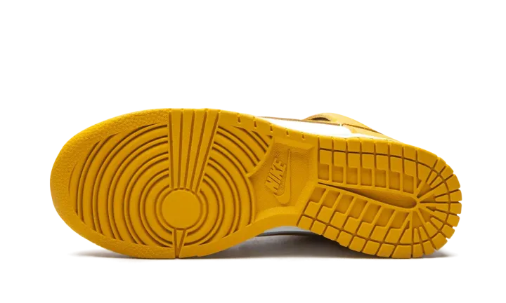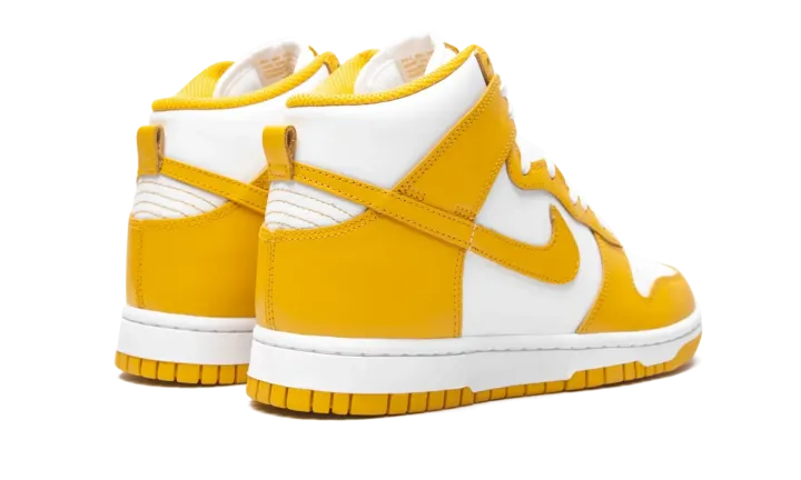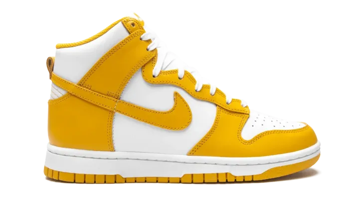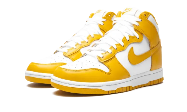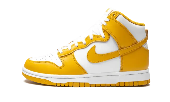 The Nike Dunk High "Dark Sulfur" gives a summer-friendly vibe to the popular high-top retro basketball shoe. Looking to the Dunk's original "Be True to Your School" collection for inspiration, the "Dark Sulfur" arrives in the same two-tone color block of models such as the "Syracuse" and "St. John's" Nike Dunk, to name two examples. White leather can be found on the perforated toe and on the mid-panel and collar. Dark Sulfur leather on the forefoot, eyelets, collar, heel, and Swoosh add a burst of color against the neutral base. The same light orange hue appears on the "Nike" and Swoosh detailing printed on the tongue tag on the white nylon tongue. A two-tone white midsole and Dark Sulfur outsole completes the look.