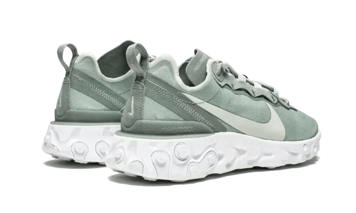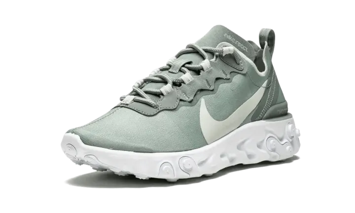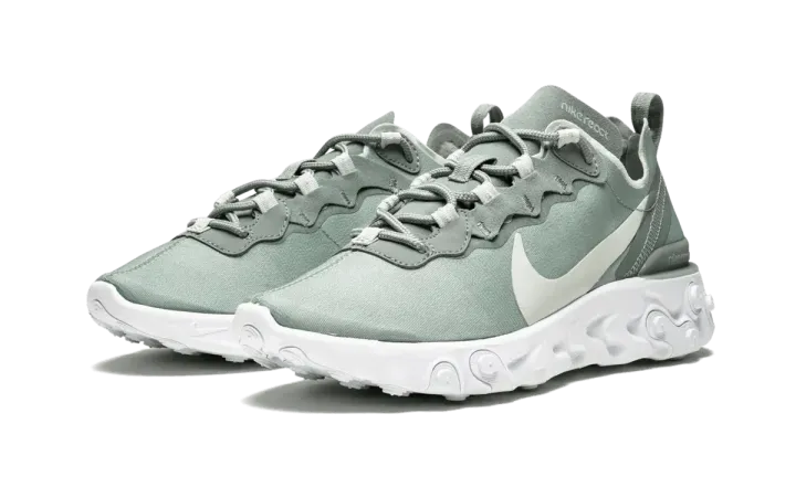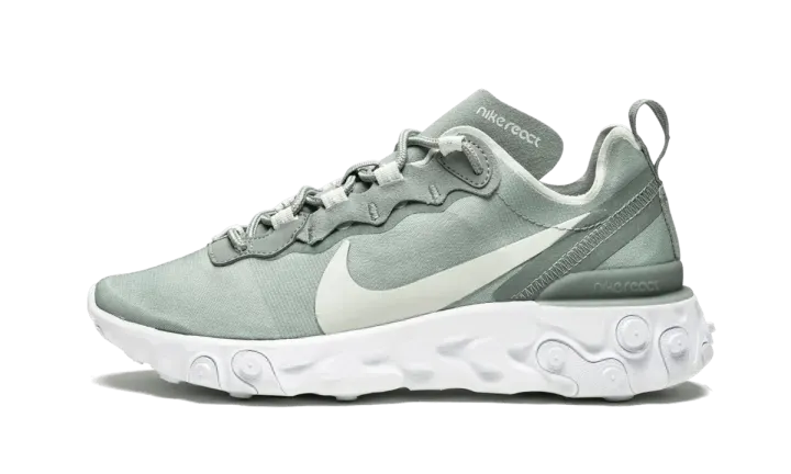 The Nike React Element 55 "Mica Green" utilizes Nike's latest React cushioning innovation in this women's style. An opaque edition of the React Element 87, the sneaker has a cutting-edge upper constructed with a solid textile and unparalleled comfort thanks to the React foam cushioning. The Nike React Element 55 "Mica Green" comes in muted green with a white sole and light silver accents.