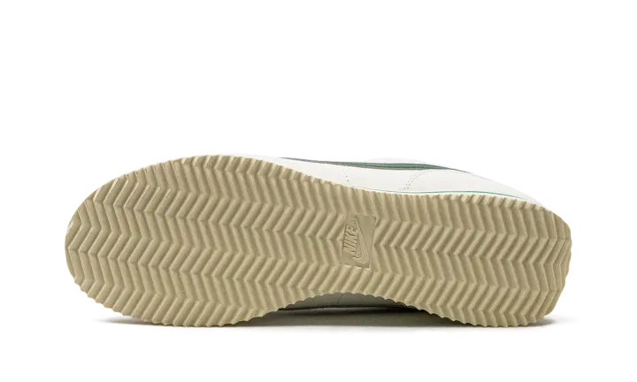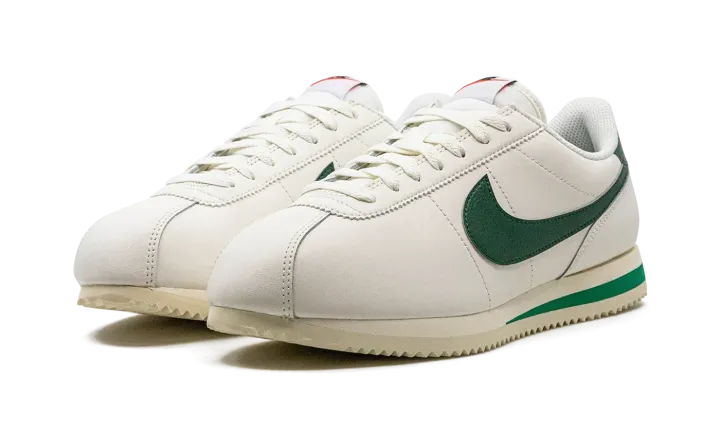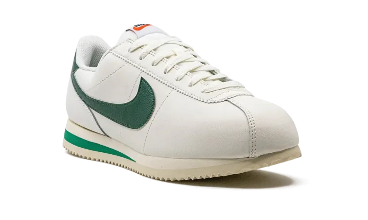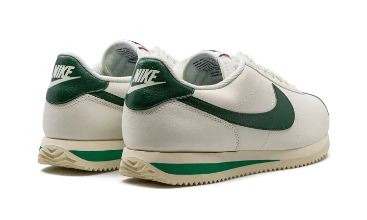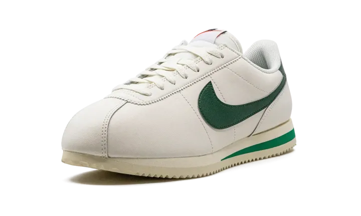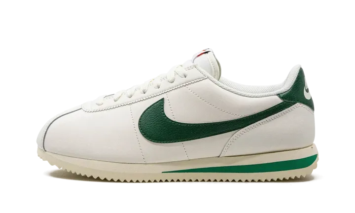 The Nike Cortez "Sail/Gorge Green" is a classic-looking colorway of the retro running and casual shoe. The "Sail/Gorge Green" Cortez features a vintage-inspired look with a Sail leather construction with Gorge Green leather Swoosh branding on the sides. The green leather heel tab features white "NIke" and Swoosh logos. A classic "Nike" patch appears on the tongue tag. Underfoot, a cream foam midsole with Gorge Green accenting completes the look.
