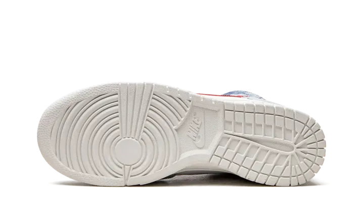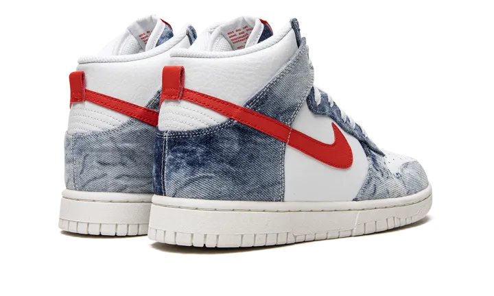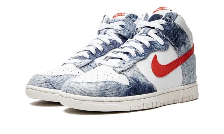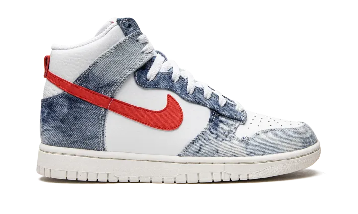 The Women's Nike Dunk High "Washed Denim" is a women's-exclusive colorway of the retro basketball shoe with a unique tie-dye, washed denim pattern on its design. A June 2022 release by Nike, the "Washed Denim" brings a warm weather-ready look to the Dunk with Washed Denim overlays against a white leather base. A Habanero Red leather Swoosh appears on either side of the shoe. Additional red accenting comes into play on the "Nike" and Swoosh logos found on the white nylon tongue tag. Underfoot, a cream rubber sole completes the look. Release date: June 29, 2022