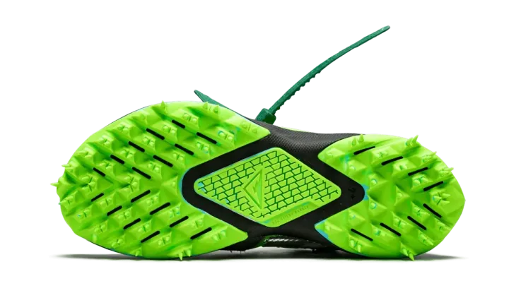 The Off-White x Zoom Terra Kiger 5 "Electric Green" is one of the three debut colorways for the unique silhouette by Virgil Abloh. The bold design features the Zoom Terra Kiger 5 trail running shoe with a radical makeover by Abloh, modified with recognizable Off-White design cues including premium materials, exposed foam on the tongue, printed text, and an orange tab. Abloh also adds a bold auxiliary lacing system and the model's most distinct detail, the spiked rubber outsole. This colorway features an Electric Green textile base with suede overlays in olive and black accents for the Swoosh branding and midsole. The spiked sole matches the neon green hue of the upper with marbled hits of bright blue mixed in. The signature Off-White zip-tie appears in green for the final touch. The Off-White x Zoom Terra Kiger 5 "Electric Green" released on June 24, 2019.