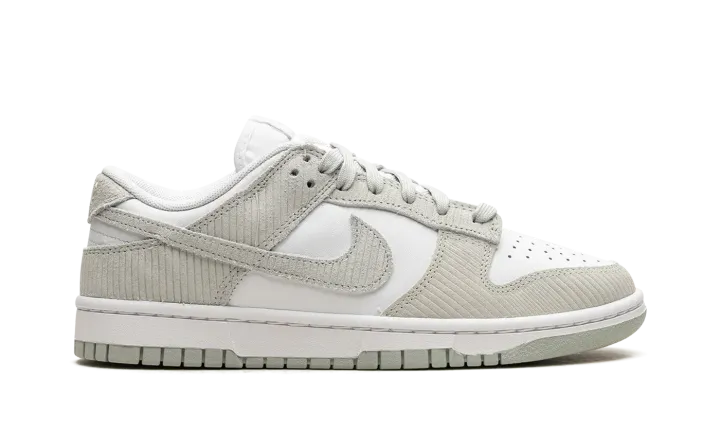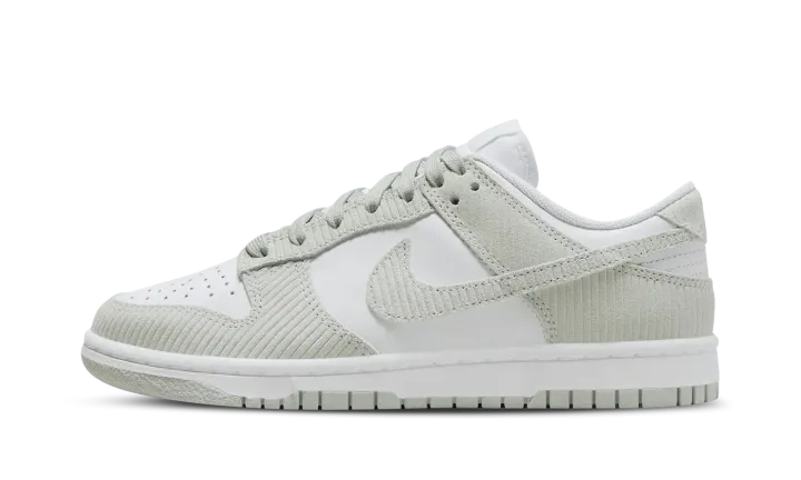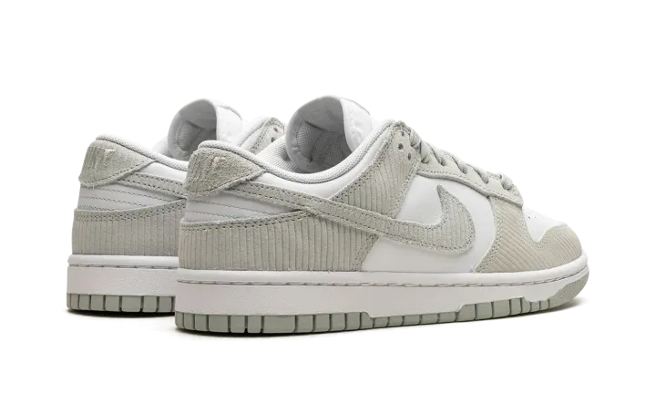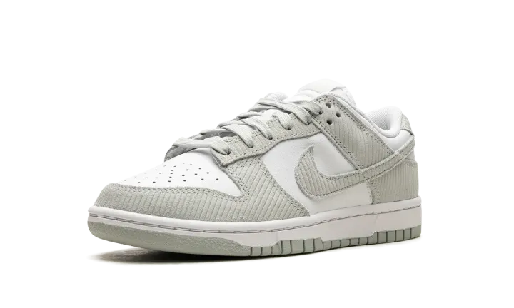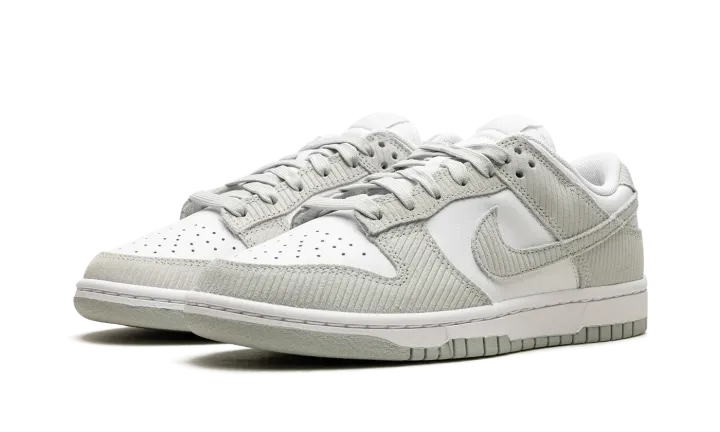The Women's Nike Dunk Low "Grey Corduroy" is a women's-exclusive colorway of the retro basketball shoe with a unique combination of materials. The construction features a white leather base that's contrasted with Light Silver corduroy overlay panels throughout the shoe. The Swoosh that appears on either side is also rendered in grey corduroy. Classic "Nike" branding is embroidered on the heel and printed on the tongue tag. A white rubber midsole and Light Silver outsole complete the look.