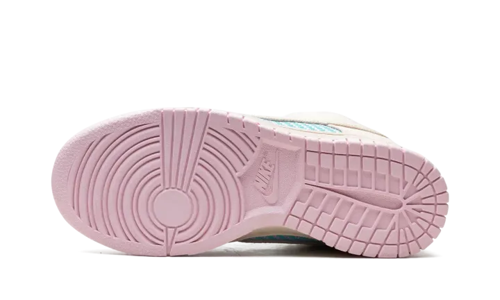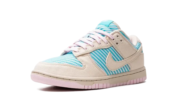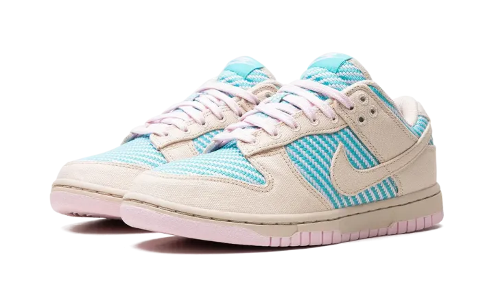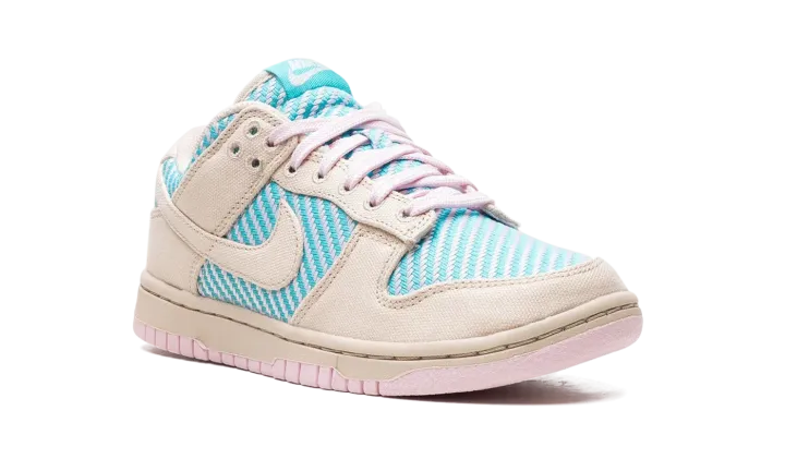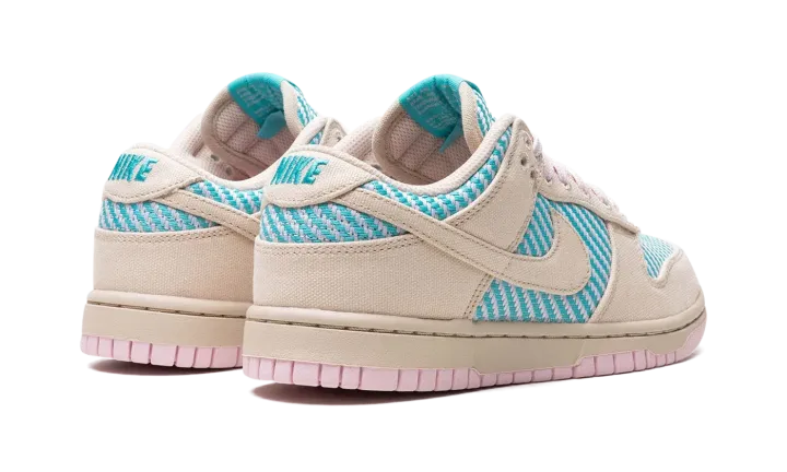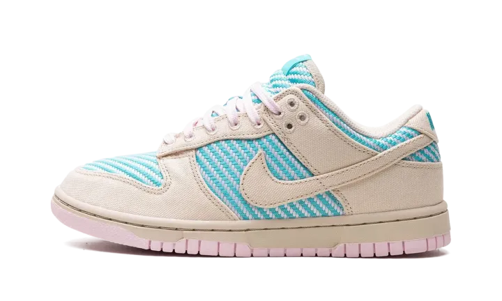 The Nike Women's Dunk Low 'Heat Wave' showcases a two-tone woven textile upper in off-white and bright teal. Sand-hued canvas covers the forefoot and heel