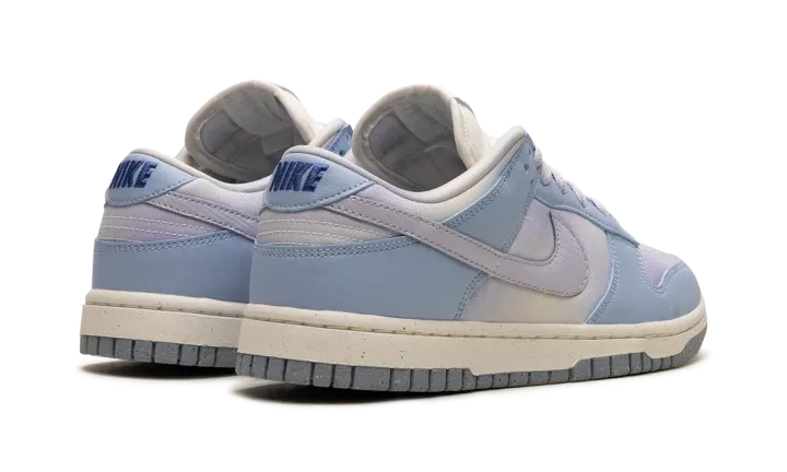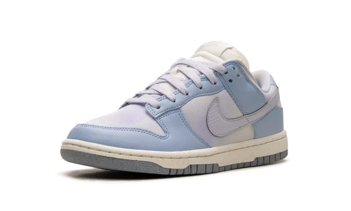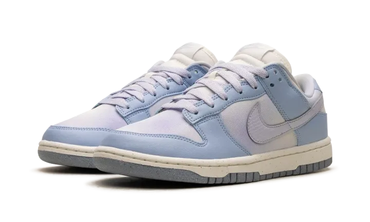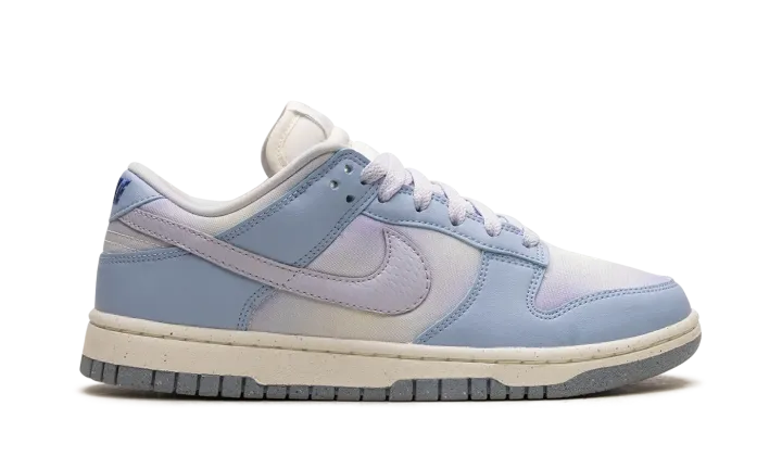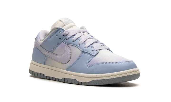 The Women's Nike Dunk Low "Blue Airbrush" is a women's-exclusive colorway of the classic sneaker with a unique airbrush finish. The toe and the mid-panel of the canvas upper feature a blue airbrush effect, while the collar and heel appear in Sail-colored canvas. The leather overlays are designed in a Cobalt Blue hue. A blue airbrush finish is applied to the Swoosh. Classic "Nike" branding appears on both the heel tab and tongue tag. Underfoot, a speckled aged midsole completes the look.