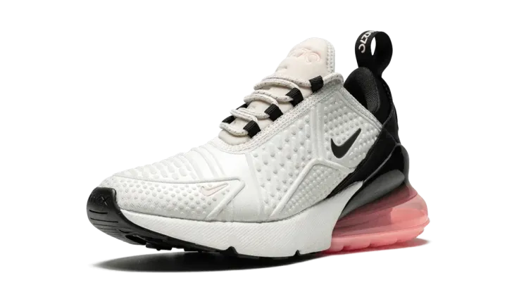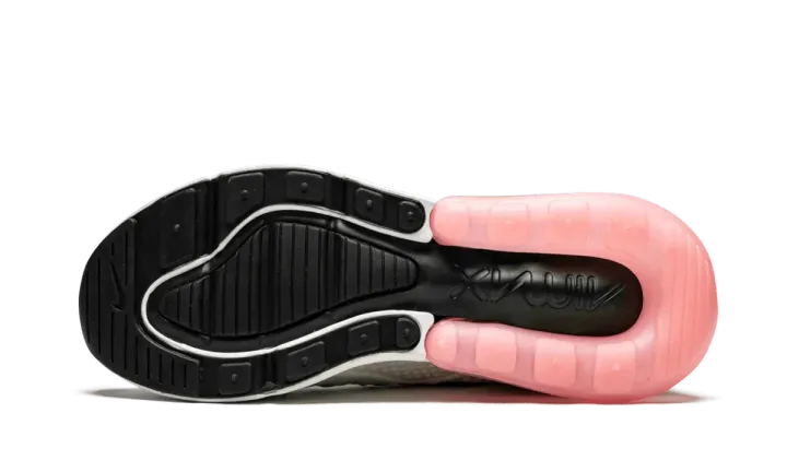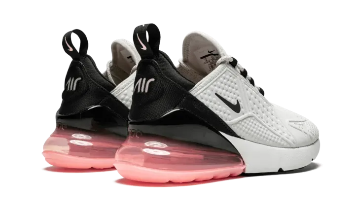 The Nike Air Max 270 Flyknit delivers a streamlined look. The lifestyle runner has a white and black color colorway with light pink accents, and the Nike Air Max 270 Flyknit is grounded nicely with a black and pink outsole. An airy Flyknit upper helps keep you cool when things get hot, and the distinct clear Air Max heel unit is Nike's largest yet. Other details include an exaggerated tongue top, a heritage logo, and a futuristic "AIR" on the heel.