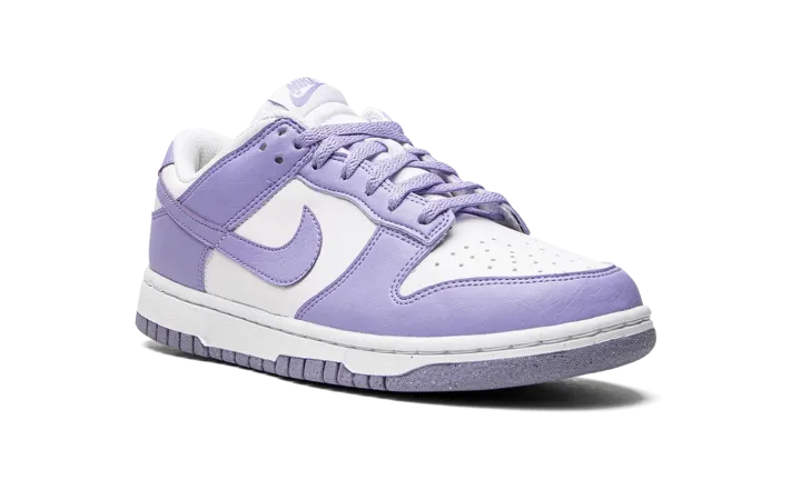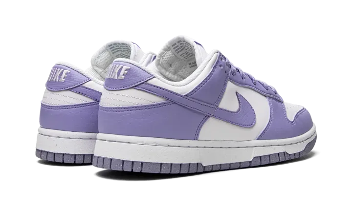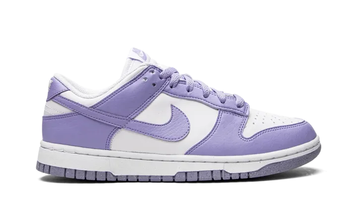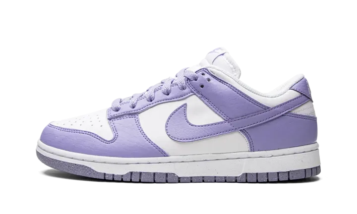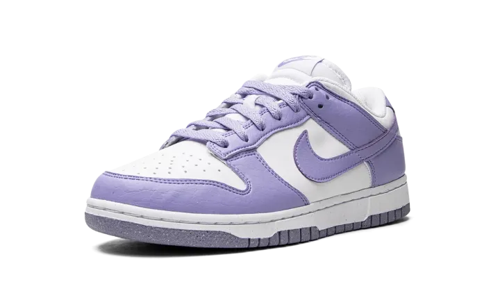 The Women's Nike Dunk Low Next Nature "Lilac" is a women's-exclusive colorway of the vintage basketball shoe made from at least 20% recycled content by weight. The eye-pleasing "Lilac" colorway was released as part of the "Move to Zero" campaign by Nike that aims to reduce the brand's carbon footprint. The shoe features a white leather base with Lilac-colored leather overlays and Swoosh branding. White "Nike" embroidery appears on the heel. Lilac "Nike" and Swoosh detailing can be found on the tongue tag. The shoe's design is rounded into form with a white rubber midsole and Lilac outsole with speckle detailing. The outsole is made from Nike's sustainable Grind rubber. Release date: July 16, 2022