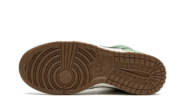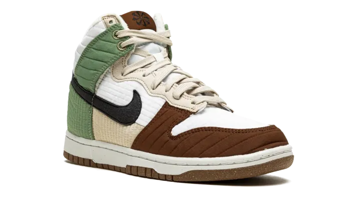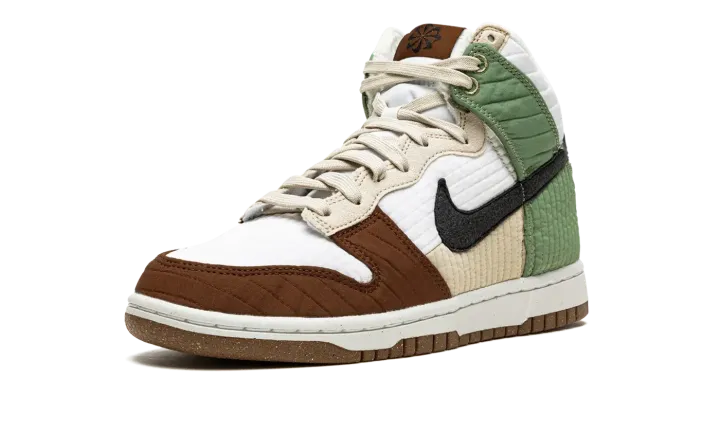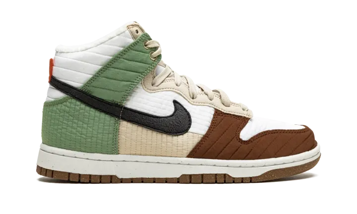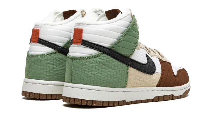 The Women's Nike Dunk High LX "Toasty" is a winter-ready colorway of the women's version of the retro basketball shoe that features a modified, eco-friendly construction. Designed to be worn in cold weather, the "Toasty," as its name implies, is complete with several design updates made specifically for winter. Constructed from 20% recycled content by weight, the shoe displays a quilted textile upper that mimics the look of winter outerwear. Mismatched panels in brown, green, and tan contrast the look of the white and tan base. A black synthetic leather Swoosh appears on both sides of the shoe. The pinwheel graphic printed on the brown tongue tag references the shoe's sustainable design. A fun-loving "Toasty" graphic appears on the insole as a nod to the warm fleece inner lining. Release date: November 3, 2021