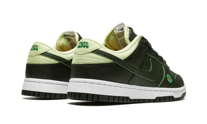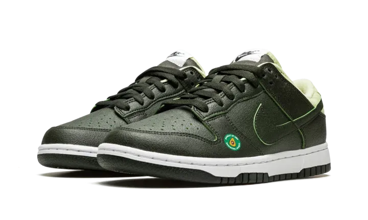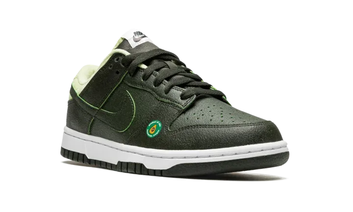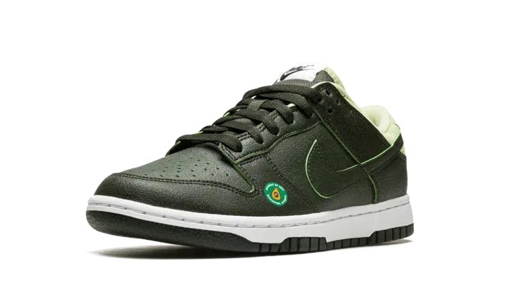 Nike nods to a popular food with the Women's Nike Dunk Low "Avocado." The shoe features a textured dark green base, similar to the outer skin of an avocado, paired with green contrasting accents resembling the inside of the fruit. Additional details include an avocado "sticker" on the lateral forefoot and insole along with a Nutrition Facts tag hiding on the inner side of the tongue tag. The "Avocado" Dunks come housed in a special packaging along with mesh shopping bag.