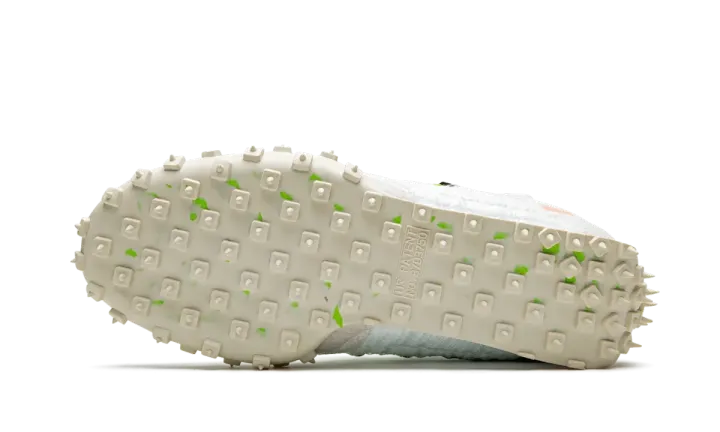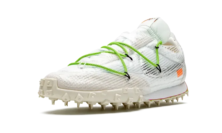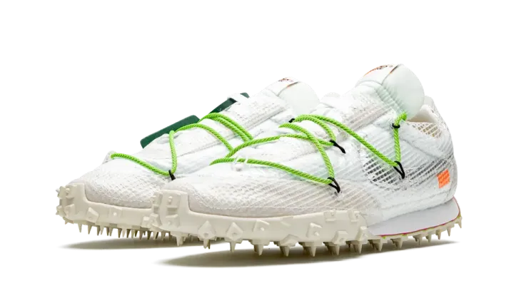 The Off-White x Nike Waffle Racer SP "Electric Green" is the women's sizing of the futuristic lifestyle sneaker imagined by Virgil Abloh and Nike. The ongoing collaboration between Abloh's fashion label and Nike has become one of the more eagerly anticipated projects in the sneaker game and this limited collection from fall 2019 including three colorways of the Waffle Racer is no different. The upper is composed of white nylon with a film-like synthetic mesh layer wrapping the entire shoe. Cream suede covers the toe, eyelets, and heel with a metallic silver Swoosh branding hit appearing on the mid-panel. Bold Electric Green laces add a pop of color to the muted tones of the upper. Completing the look of the re-imagined Waffle Racer in women's sizing is a cream colored spiked outsole that mirrors a pair of track spikes. Release date: October 24th, 2019.