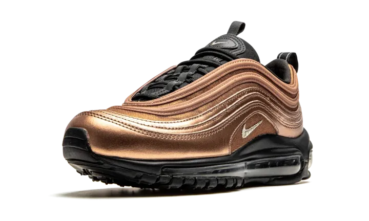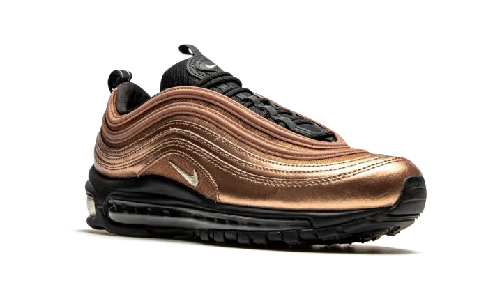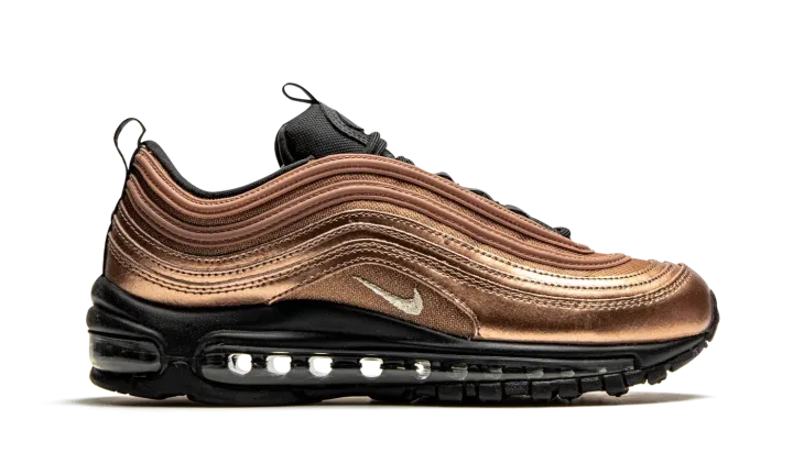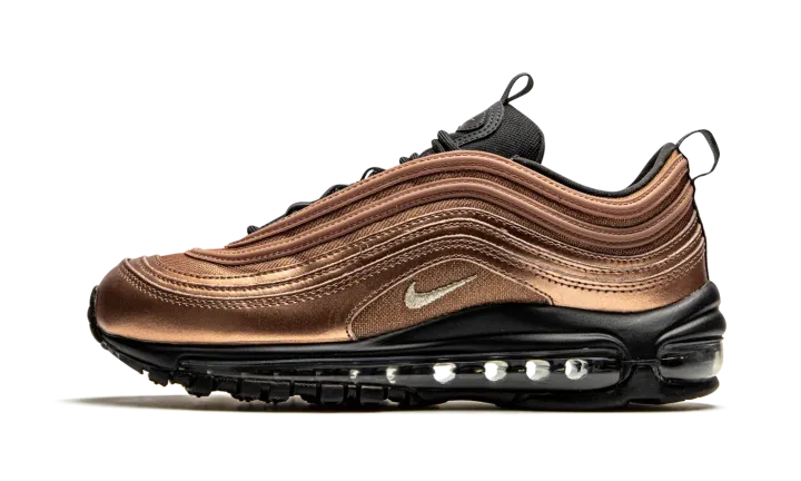 The Women's Nike Air Max 97 "Copper" gives the Air Max 97 silhouette an eye-catching, molten treatment. Dubbed "Copper," this Nike lifestyle sneaker features a metallic copper premium leather and mesh upper that creates a monochromatic look on the shoe's signature wavy lines and sits atop a sleek black outsole. For a touch of elegance and contrast, the tongue, heel pull tab, and mudguard match the sole in black. Rounding out the design is the iconic 3M reflective piping details found throughout the upper.