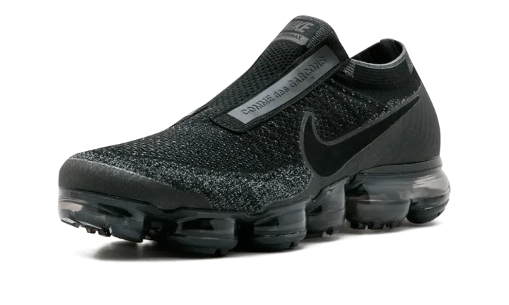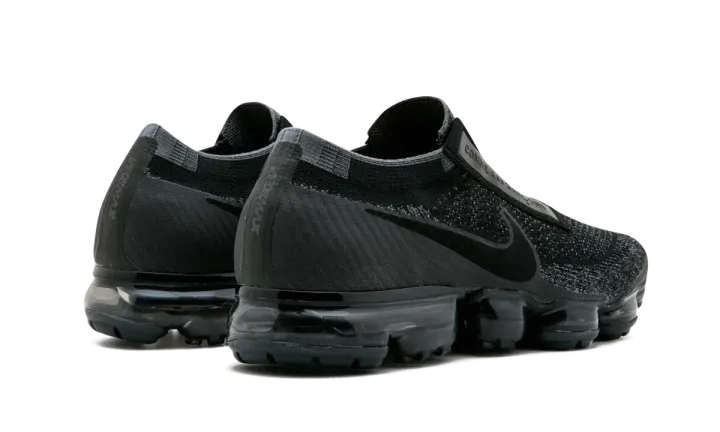 The debut of the Air VaporMax silhouette was quickly followed by the first-ever collab using silhouette with the help of French brand COMME des GARÇONS; together the two deliver a lace-less version of the VaporMax for women. The COMME des GARÇONS x Nike Air VaporMax FK arrived in two colorway options designed by CDG founder Rei Kawakubo: a murdered-out all-black motif and a futuristic silver look. Here we see the former, featuring a slip-on construction, with CDG branding on the lateral and medial sides where the laces would normally appear. The heel features a fused overlay. And finally, you can't miss the full-length VaporMax air unit.